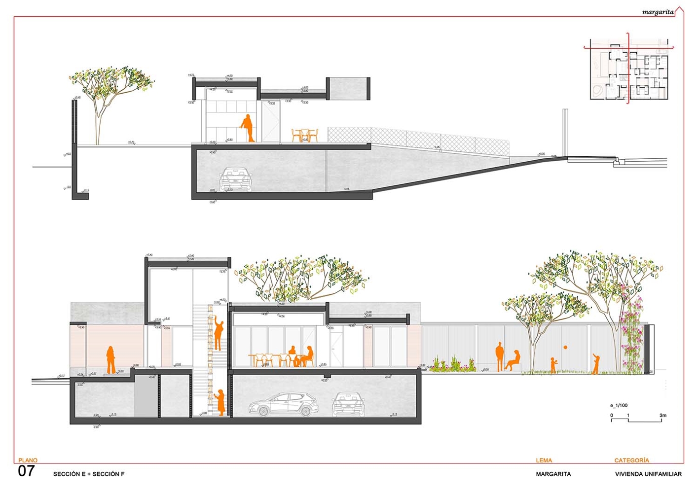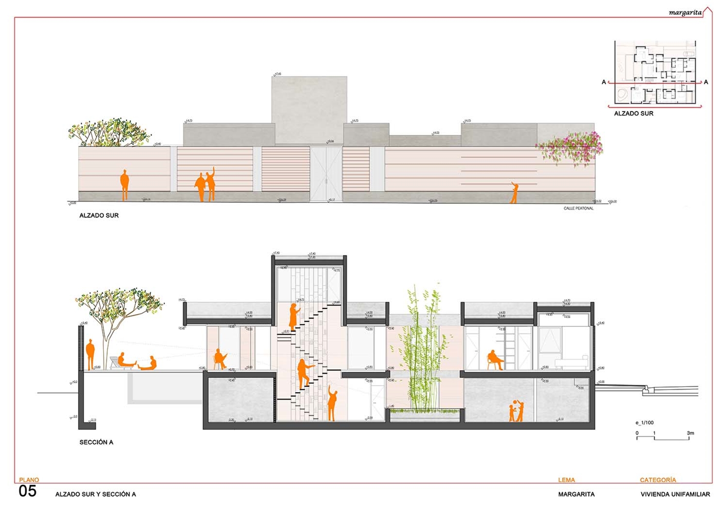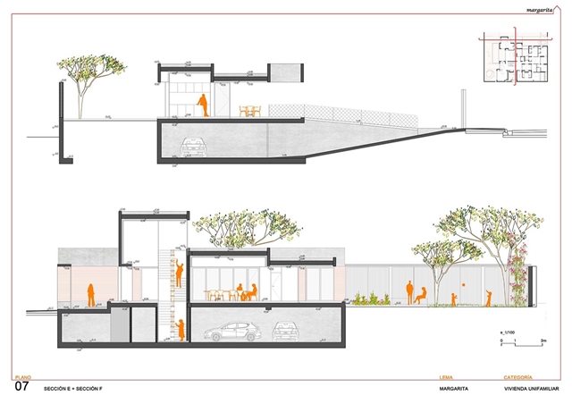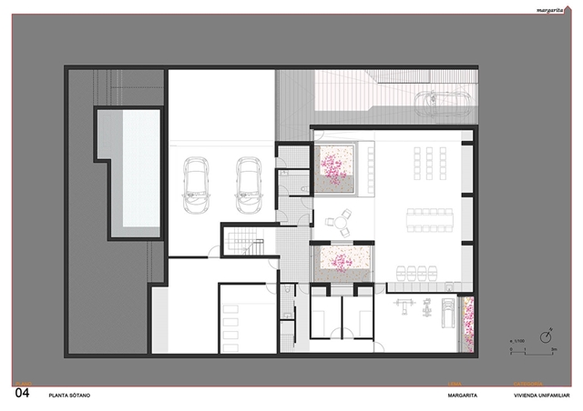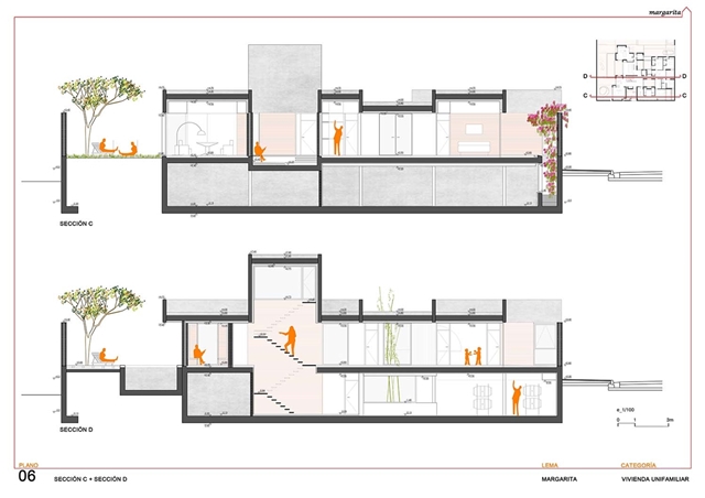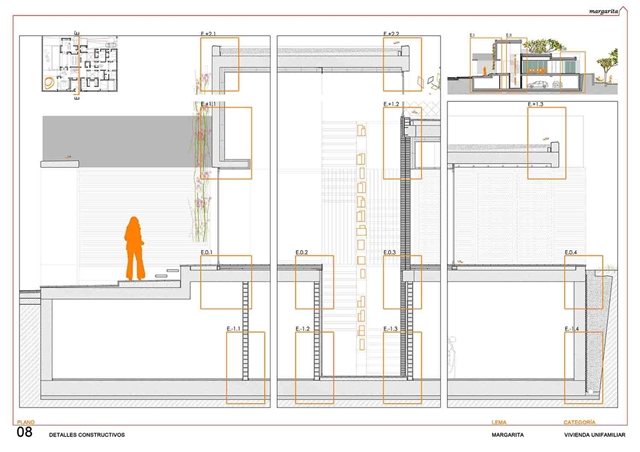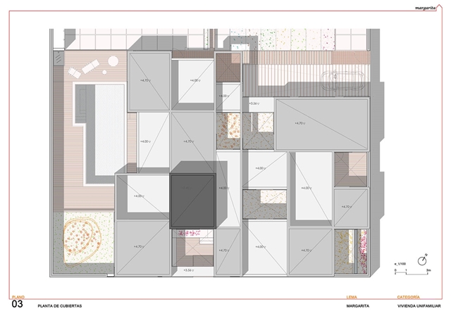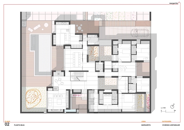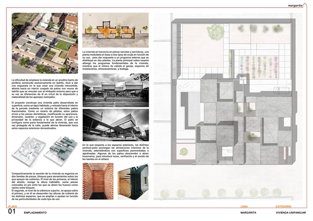 El proyecto construye una vivienda patio desarrollada en superficie, como un tapiz habitado, y volcada hacia el interior de la parcela mediante un sistema de diferentes patios fraccionados. Como un rosario de pétalos, estos patios sirven a las piezas domésticas, modificando su apariencia, dimensión, carácter, y vegetación en función del uso y la privacidad de la estancia a la que abren. El patio se configura como parte fundamental de la vivienda, que una vez protegida de la calle, puede abrirse libremente hacia estos espacios exteriores domesticados.