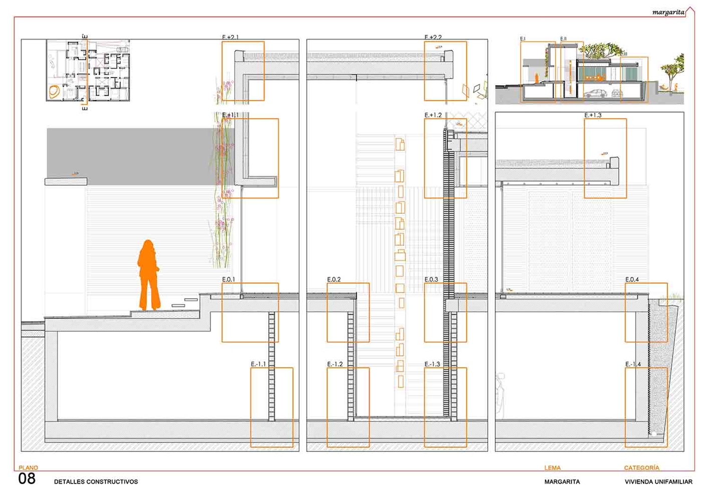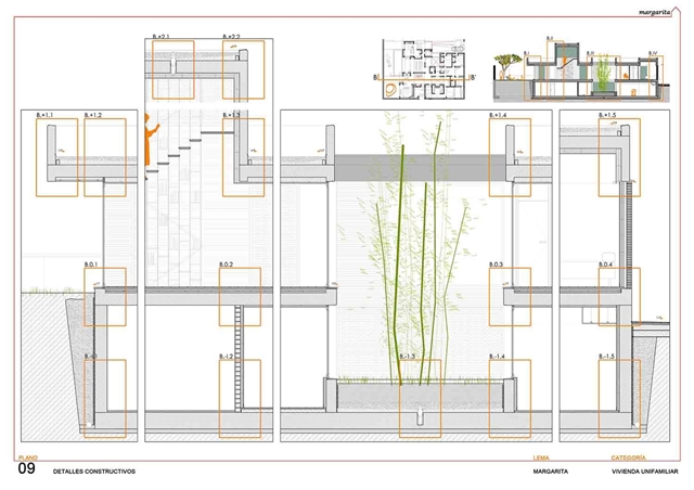 Compositivamente la sección de la vivienda se organiza en dos bandas de piezas, bloques para cerramientos sobre los que apoyan las cubiertas. El nivel de los primeros, el inferior del alzado, recoge la altura habitable, como piezas colocadas en pie entre las que se abren los huecos como vacíos entre bloques. El segundo, el nivel de la cobertura superior, se apoya sobre el primero, y en él se desarrollan las alturas de cubierta de los distintos espacios, que se amplían o ajustan en función de las particularidades de cada tipo de uso.
