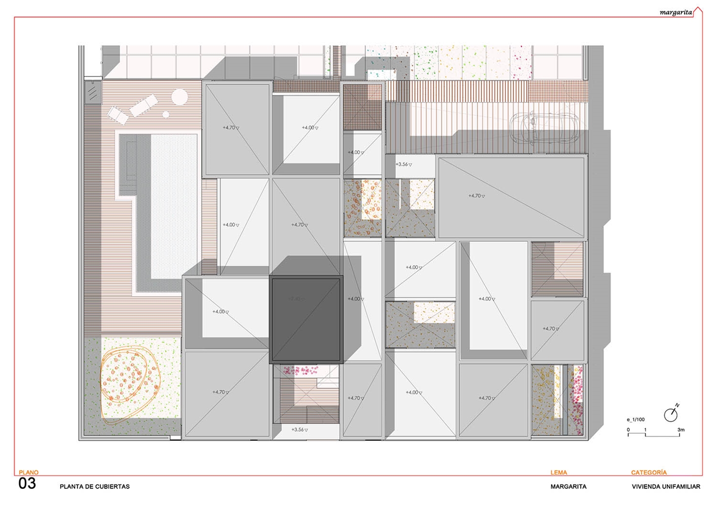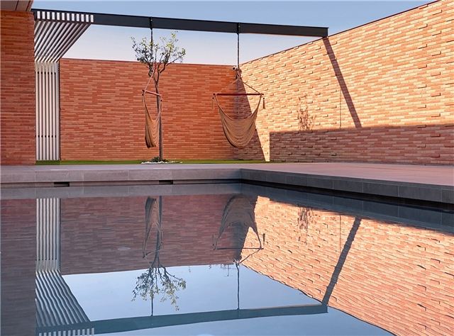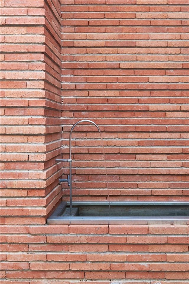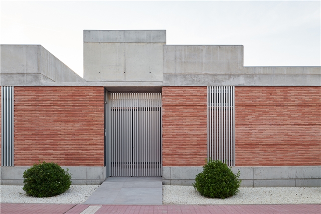 Matéricamente el proyecto gravita entre dos puntos: la profusión de la cerámica rojiza, tradicional, que aporta calidez y cierta artesanía y el hormigón que construye una serie de “cúpulas” que van levitando o apoyando sobre esos paños cerámicos en función del uso y de la privacidad busca que se consigue también mediante celosías, huecos abiertos, tamizados o cerrados. En los huecos tamizados se ha buscado un juego lumínico y transpirable de las celosías cerámicas, con un guiño al mudéjar tan propio e identitario de la zona.