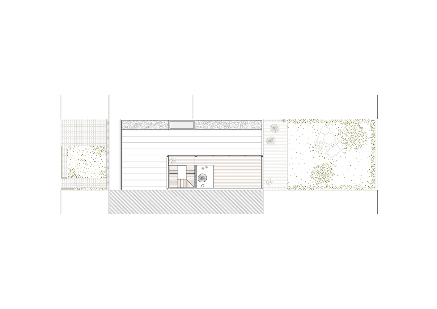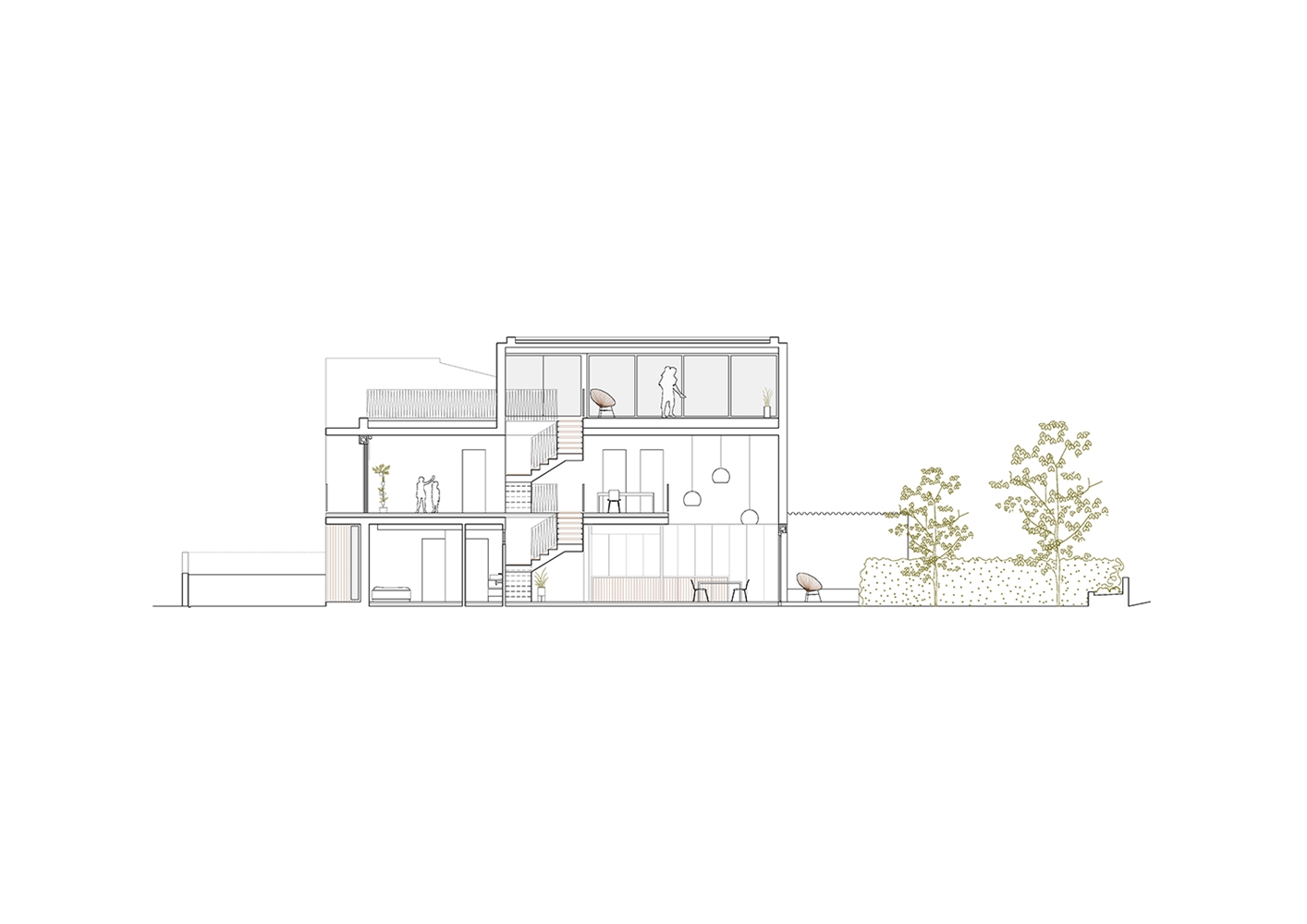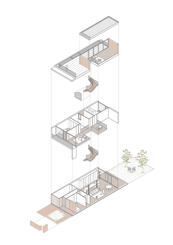 La planta baja contiene el acceso y una conexión lineal con el jardín. Encontramos una franja inicial con el garaje, una habitación y un baño, y una segunda franja que integra la cocina, el cuarto de estar y el comedor, conectando con el resto de plantas mediante los dobles y triple espacios que unen la zona de día con el estudio y la zona de juegos de planta primera, y con el espacio polivalente de planta segunda. Completan el programa dos habitaciones, una terraza y un baño en planta primera y una terraza-mirador en planta segunda.