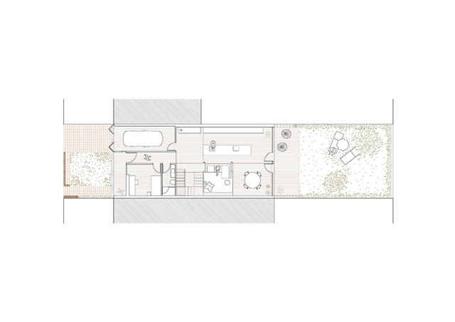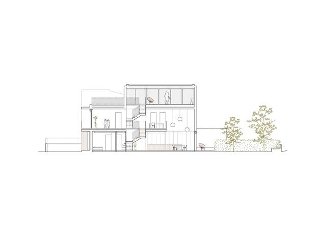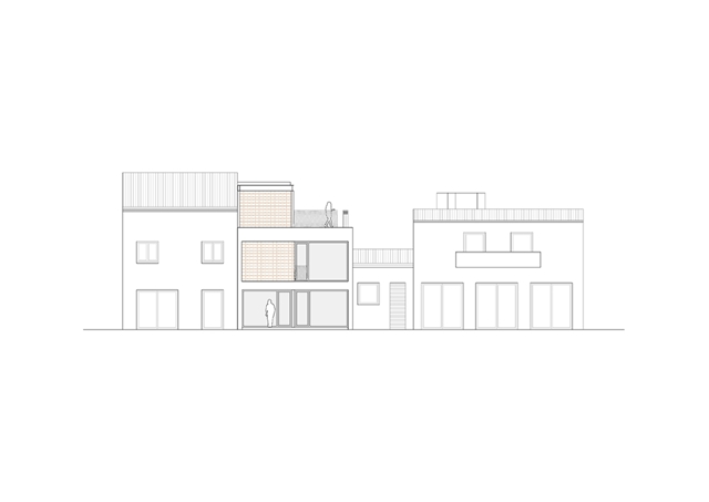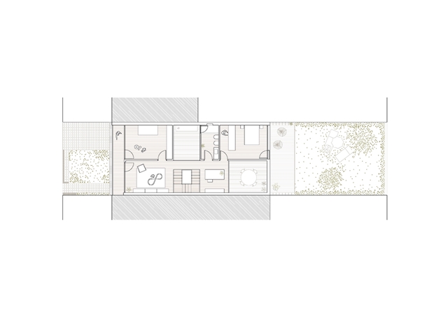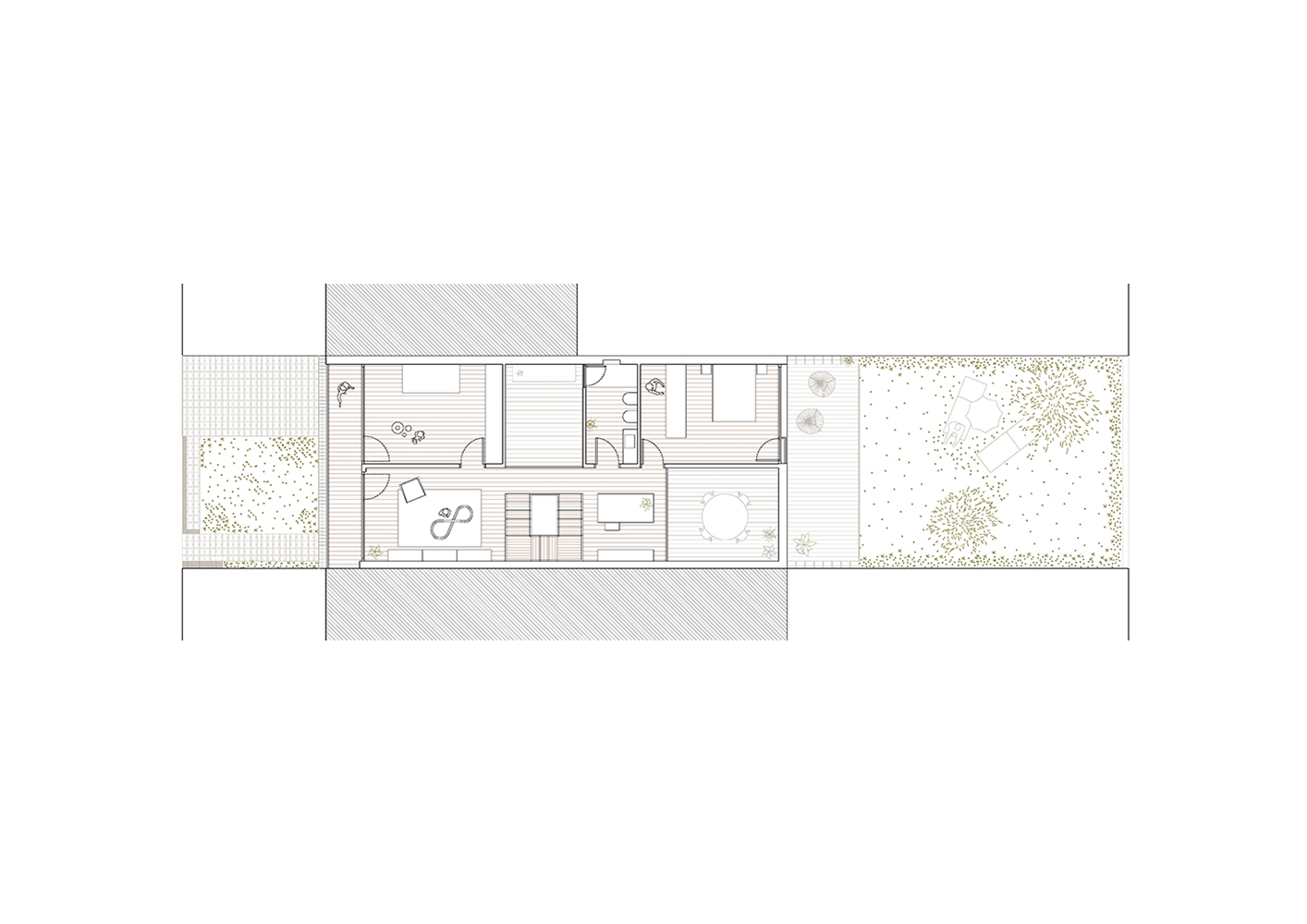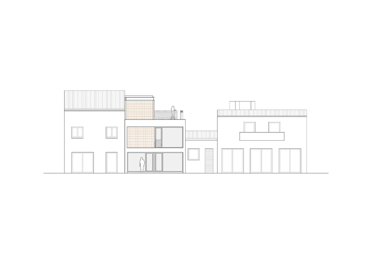La planta baja contiene el acceso y una conexión lineal con el jardín. Encontramos una franja inicial con el garaje, una habitación y un baño, y una segunda franja que integra la cocina, el cuarto de estar y el comedor, conectando con el resto de plantas mediante los dobles y triple espacios que unen la zona de día con el estudio y la zona de juegos de planta primera, y con el espacio polivalente de planta segunda. Completan el programa dos habitaciones, una terraza y un baño en planta primera y una terraza-mirador en planta segunda.