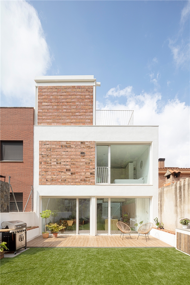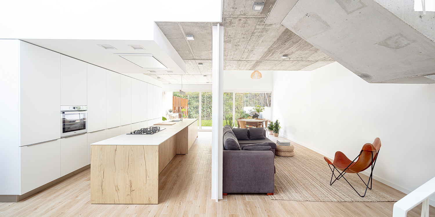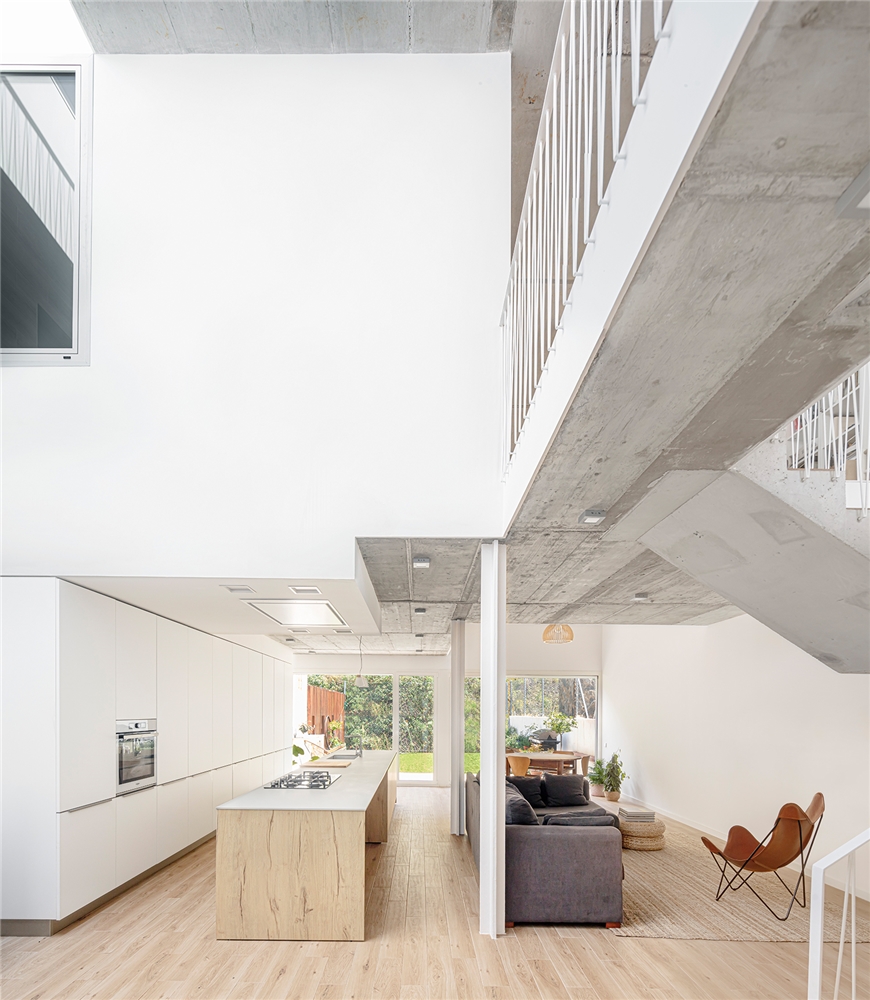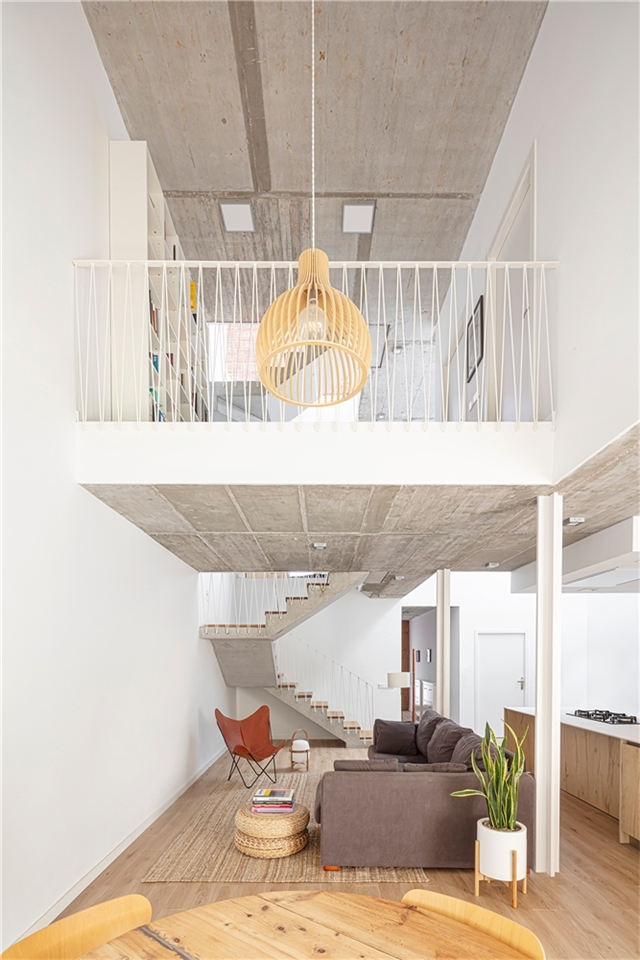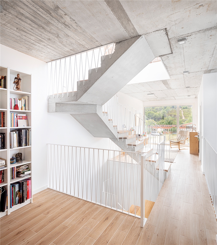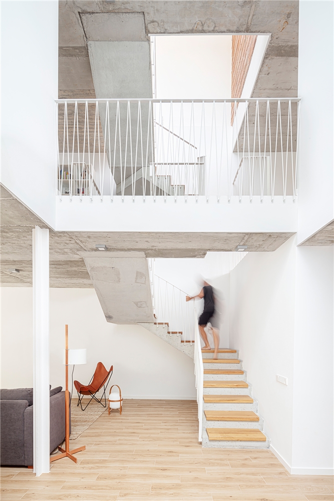 La casa se articula mediante la escalera, situada en un punto específico para conseguir que la conexión con las tres plantas sea óptima. Un lucernario complementa uno de los dobles espacios, iluminando toda la parte central de la vivienda.