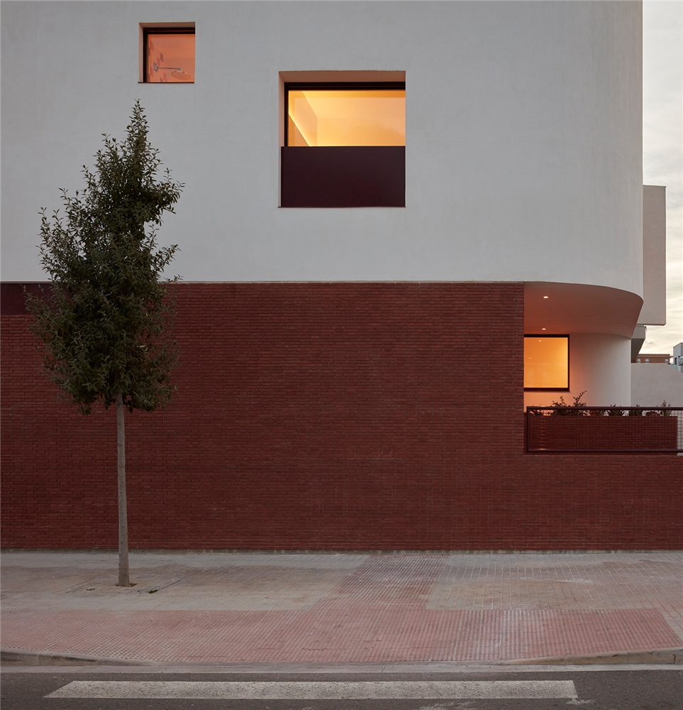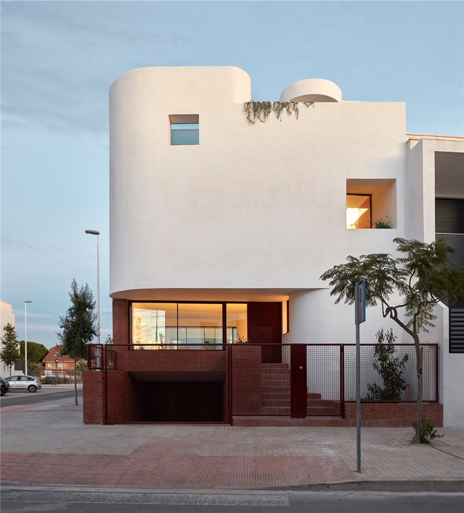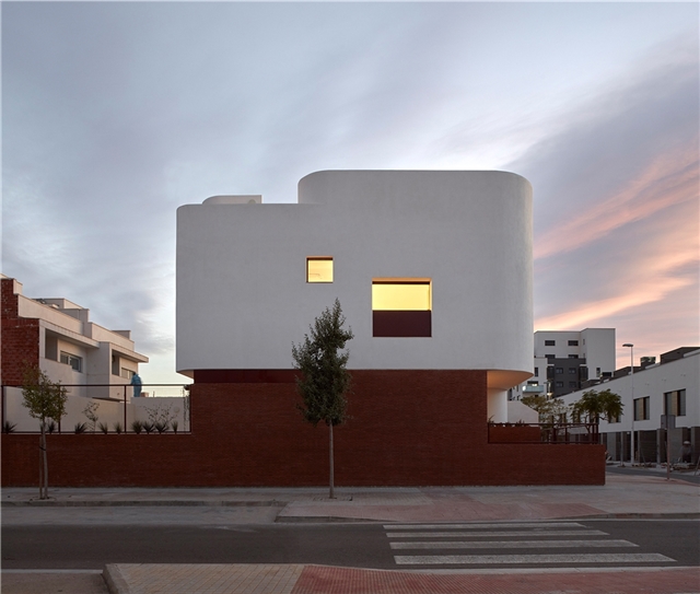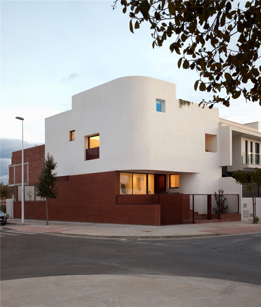 El proyecto pretende responder a una esquina de manzana donde un alzado continuo, sin aristas, se ofrece para ser visto desde todos los ángulos, sin priorizar una mirada sobre otra. La curva, entendida como línea sin discontinuidad se convierte en la herramienta de trabajo para una vivienda que pretende formar parte del entorno que la rodea. Un zócalo de ladrillo resuelve el encuentro con la cota 0 y da apoyo el elemento continuo y estratégicamente perforado para manifestar la riqueza espacial de su interior. En su interior, la vivienda no obedece a órdenes preestablecidos, permitiendo a la sección descubrir espacios y vincularlos entre ellos para mantener la luz natural y la mirada siempre en movimiento.