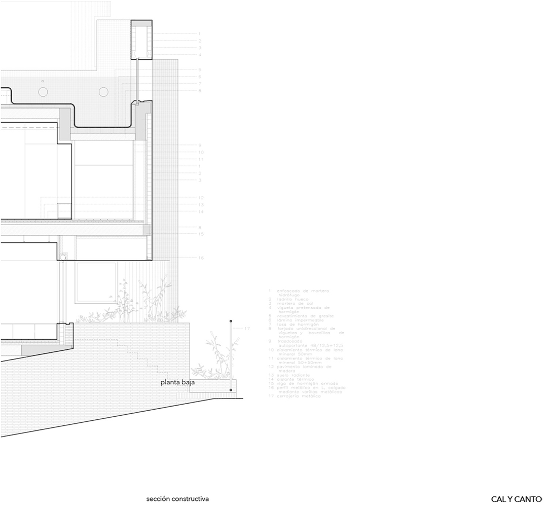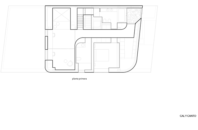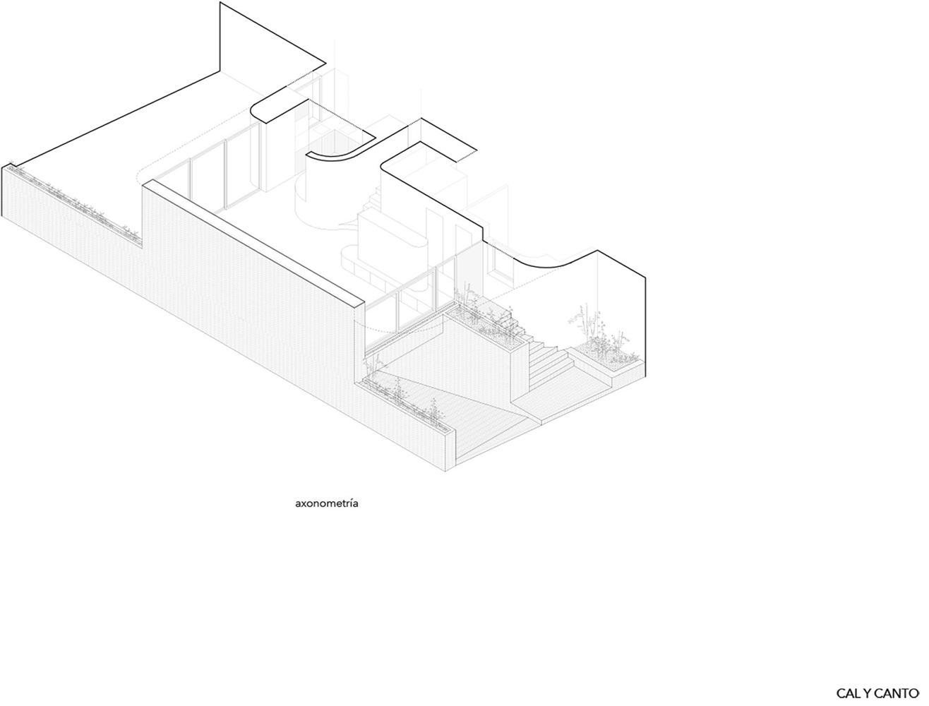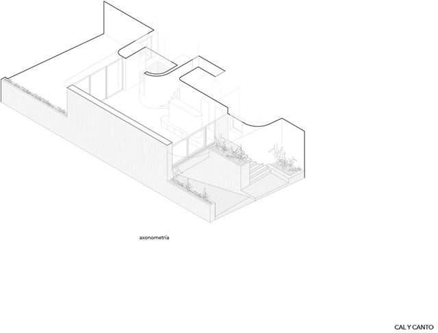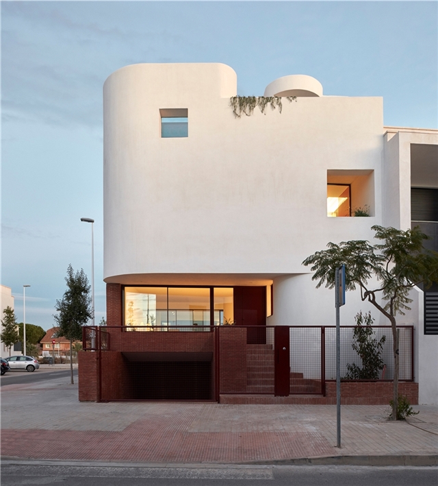 El proyecto pretende responder a una esquina de manzana donde un alzado continuo, sin aristas, se ofrece para ser visto desde todos los ángulos, sin priorizar una mirada sobre otra. La curva, entendida como línea sin discontinuidad se convierte en la herramienta de trabajo para una vivienda que pretende formar parte del entorno que la rodea. Un zócalo de ladrillo resuelve el encuentro con la cota 0 y da apoyo el elemento continuo y estratégicamente perforado para manifestar la riqueza espacial de su interior. En su interior, la vivienda no obedece a órdenes preestablecidos, permitiendo a la sección descubrir espacios y vincularlos entre ellos para mantener la luz natural y la mirada siempre en movimiento.