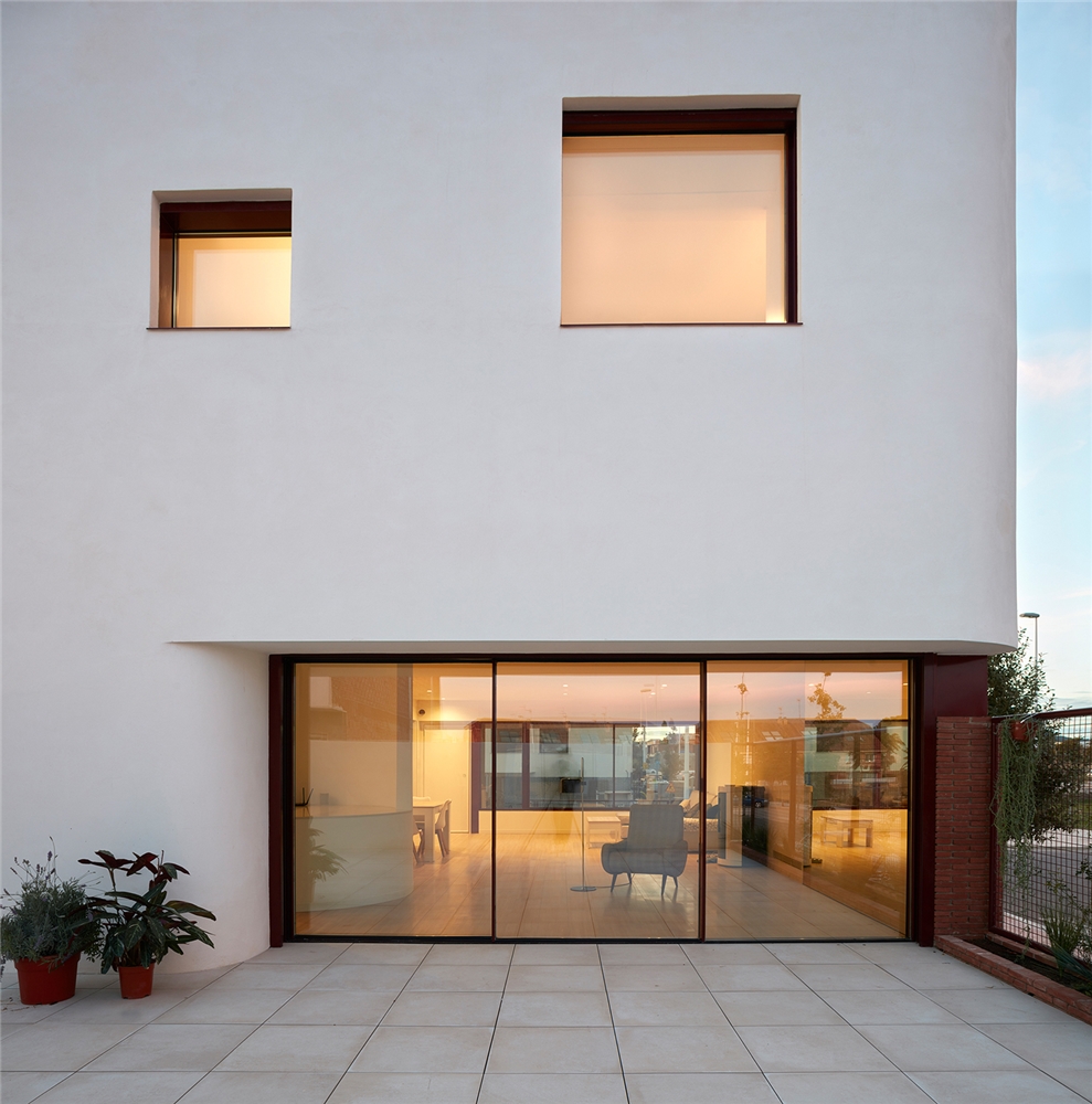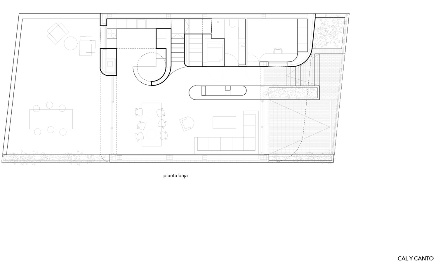 La planta baja recoge el uso diurno de la vivienda, esta se entiende como un espacio único cuyos usos son configurados por distintas curvas y planos. El patio, fundido con el interior a través del vidrio y creado con este un espacio que podría ser único, pone fin al recorrido, en él, el granate de la cerrajería y el verde de la vegetación componen la frontera entre la vivienda y la calle.
