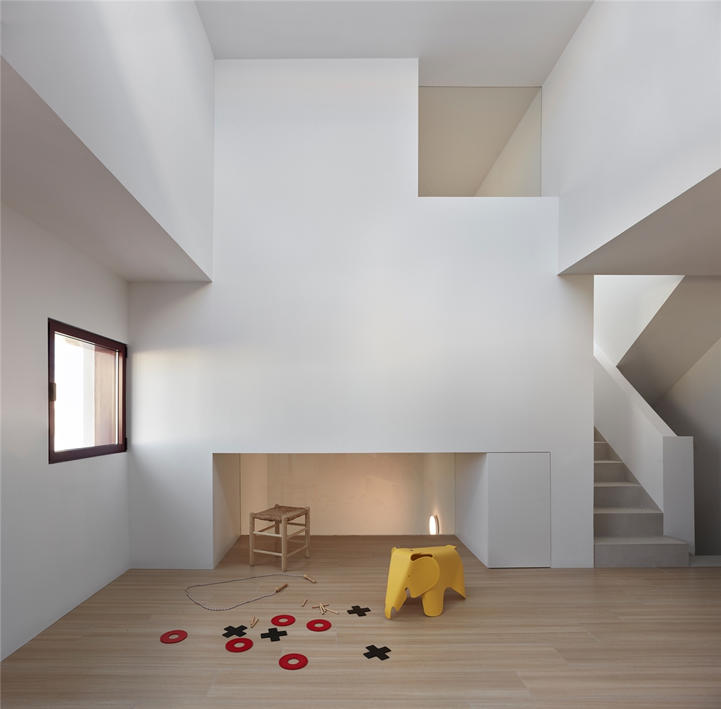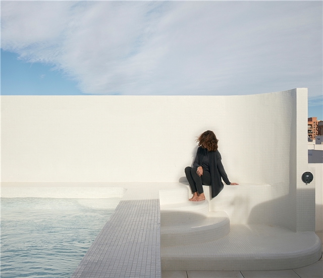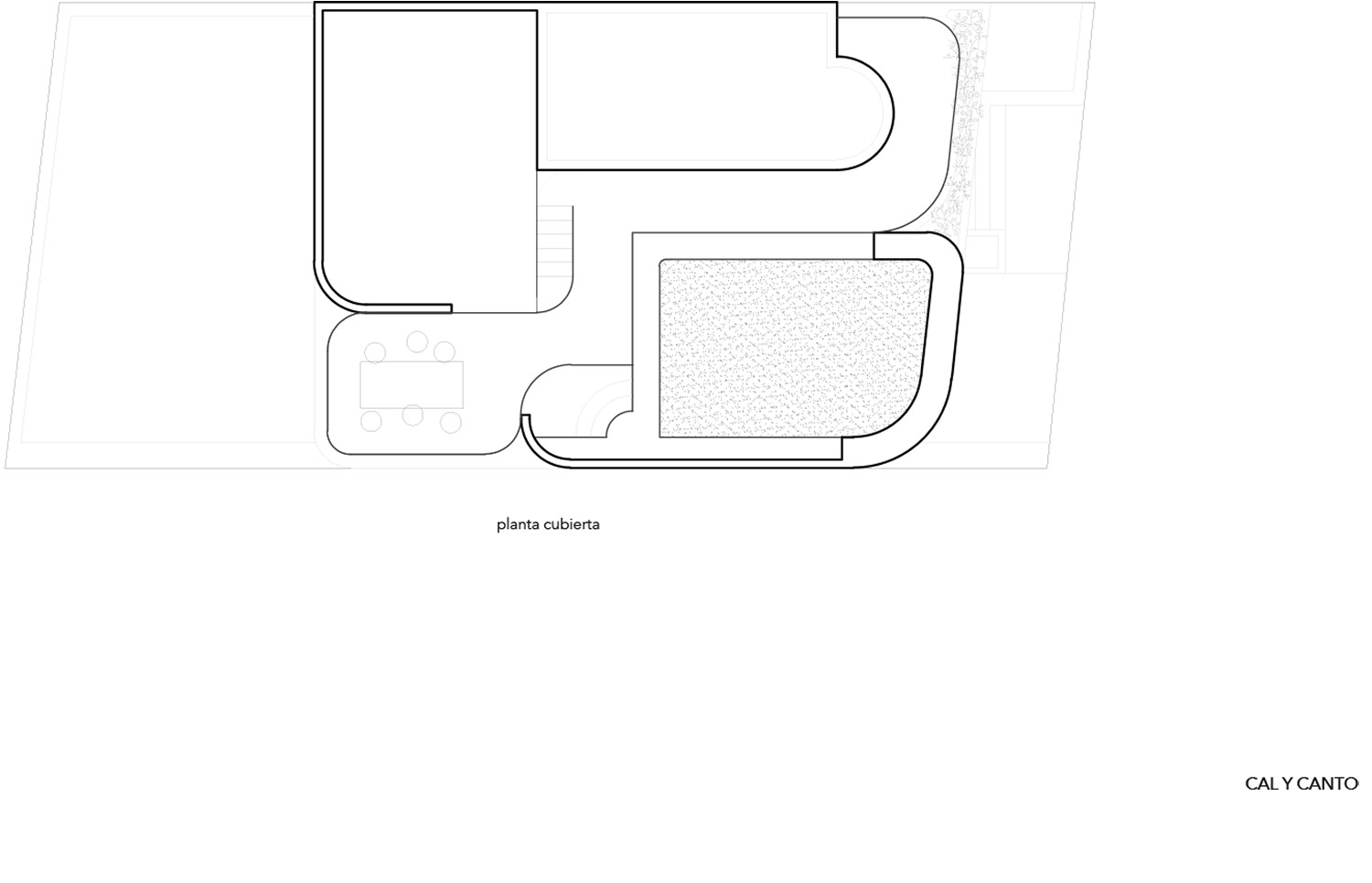 El juego de alturas y entreplantas, permite que los espacios más privados y de uso individual se ubiquen en los siguientes niveles, siendo estos las habitaciones y el estudio. El recorrido ascendente finaliza en la planta cubierta, un espacio abierto y único donde la secuencia espacial y de usos viene de nuevo acotada por planos de distintas alturas y curvas. En ella la piscina acompaña en lenguaje y forma al resto del proyecto y se concreta como uno de los lugares singulares del mismo.