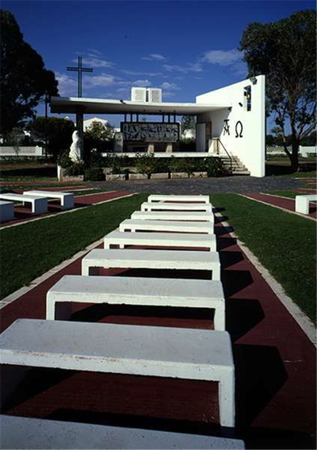Capilla en la Urbanización Turística de Roquetas de Mar. "Con objeto de poder atender a las necesidades de culto religioso, estaba prevista en los Planos de la Urbanización, la reserva de una parcela ajardinada para la construcción de una capilla. De acuerdo con el emplazamiento, y teniendo en cuenta las necesidades de uso y carácter turístico del lugar, se ha proyectado una capilla abierta consistente en un altar, protegido por una cubierta y por muros pantalla. De este modo, se consigue que el culto pueda celebrarse sin perturbaciones climatológicas de lluvia, sol o viento. Los fieles, distribuidos en la zona ajardinada, gozarán de perfecta visión sobre el altar, dado que éste ocupa una posición dominante, al estar situado sobre una placa de hormigón que se levanta unos peldaños sobre la superficie del estanque que le rodea"(de la Memoria del Proyecto)