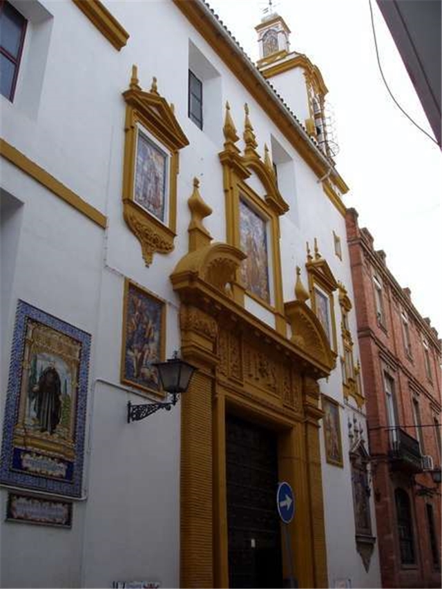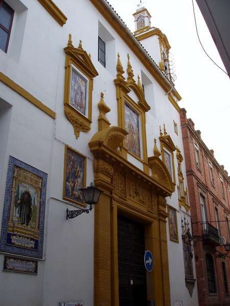 El edificio de la capilla, una nave cubierta de tres tramos cubiertos por bóvedas de nervaduras, y de la casa de la Compañía, es un encargo de la Compañía de Jesús que Aníbal González resuelve en su personal eclecticismo superponiendo elementos neogóticos a una estructura clasicista.