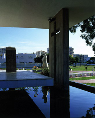 Capilla en la Urbanización Turística de Roquetas de Mar. "Con objeto de poder atender a las necesidades de culto religioso, estaba prevista en los Planos de la Urbanización, la reserva de una parcela ajardinada para la construcción de una capilla. De acuerdo con el emplazamiento, y teniendo en cuenta las necesidades de uso y carácter turístico del lugar, se ha proyectado una capilla abierta consistente en un altar, protegido por una cubierta y por muros pantalla. De este modo, se consigue que el culto pueda celebrarse sin perturbaciones climatológicas de lluvia, sol o viento. Los fieles, distribuidos en la zona ajardinada, gozarán de perfecta visión sobre el altar, dado que éste ocupa una posición dominante, al estar situado sobre una placa de hormigón que se levanta unos peldaños sobre la superficie del estanque que le rodea"(de la Memoria del Proyecto)