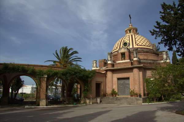 El cementerio de Jerez de la Frontera se localiza en las afueras de la ciudad, en la carretera que conduce al vecino pueblo de Estella del Marqués. El conjunto representa un claro ejemplo de la arquitectura que acompañó a los primeros años del franquismo, en el que la modernidad de las tendencias art decó quedó ahogada en referencias a la monumentalidad berniniana. La capilla se encuentra en la cabecera del conjunto, que ofrece un espacio abierto para la llegada de visitantes al recinto. En esta cabecera, dos edificios avanzan a izquierda y derecha hasta alinearse a la carretera, ofreciendo alojo a las dependencias administrativas y de funcionamiento interno de la instalación. Dos pórticos de arcos de medio punto, que en planta forman un cuarto de círculo, unen dichos volúmenes laterales a la capilla. Los edificios laterales, la capilla central y el pórtico se construyen con ladrillo visto, y cuentan con un zócalo de piedra caliza. La capilla es un templo de planta centrada, con los pies orientados hacia la carretera y el altar hacia el interior del cementerio. La capilla sobresale como el elemento más alto del conjunto, y la cúpula que la cubre, revestida con azulejos cerámicos, se muestra con rotundidad hacia la el espacio de acceso y al interior del cementerio. Como elementos significativos de este exterior, es necesario señalar por su inspiración decó las ocho esculturas que coronan las pilastras que rodean el tambor de la cúpula, emparejadas dos a dos, en los cuatro cuadrantes del edificio. El interior de la capilla se ilumina a través del óculo de la cúpula, que se cubre con una pequeña linterna. El interior de la cúpula no cuenta con revestimiento, y muestra la piedra caliza lisa en su intradós. Pilastras toscanas construidas en ladrillo se alzan sobre el zócalo de piedra y sostienen la cúpula. La composición de la capilla, así como su materialidad, denotan un carácter sobrio y sencillo.