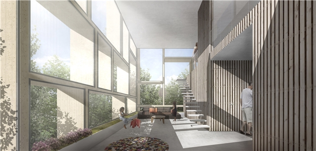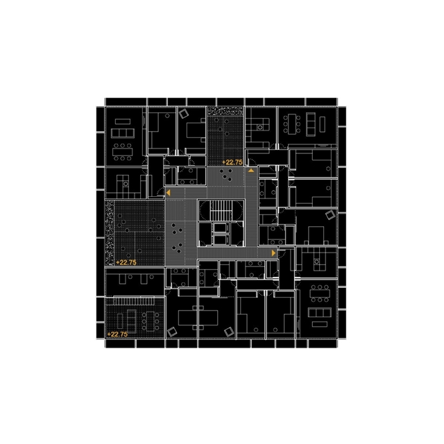 La madera entendida como el material constructivo único y singular. Respetuoso con el medio ambiente, se muestra en el exterior y en el interior del edificio. El núcleo central está hecho de paneles CLT. El perímetro está reforzado con un zuncho perimetral estructural. Entre estos dos elementos, y uniéndolos, se colocan paneles CLT. La estructura vertical interior también está hecha de paneles de madera encolada que se adaptan a los diferentes diseños de los planos y las unidades de vivienda. Los alzados están hechos con paneles estructurales CLT, y su composición libre le da a la ciudad una nueva referencia visual icónica.