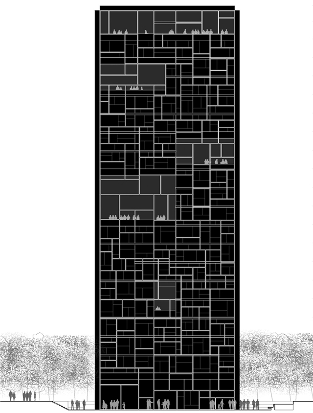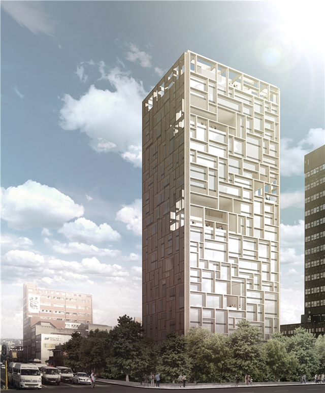 Un nuevo punto de referencia en la ciudad de Durban. Una nueva torre de madera se eleva del suelo entre los árboles. Está compuesto por alzados libres, impredecibles, que como brise-soleis protegen el interior del edificio del sol entrante. Como un nuevo habitante del siglo XXI, su construcción también es una respuesta a su tiempo. Una torre de vivienda modular experimental, construida completamente con elementos estructurales de madera. El diseño de la esvástica en todos las plantas, permite una variación aleatoria de las unidades de vivienda y otras partes del edificio. Al hacer esto, es posible una composición libre de planos, secciones y alzados. Es entonces, un modelo tipológico con infinitas combinaciones estéticas y funcionales.