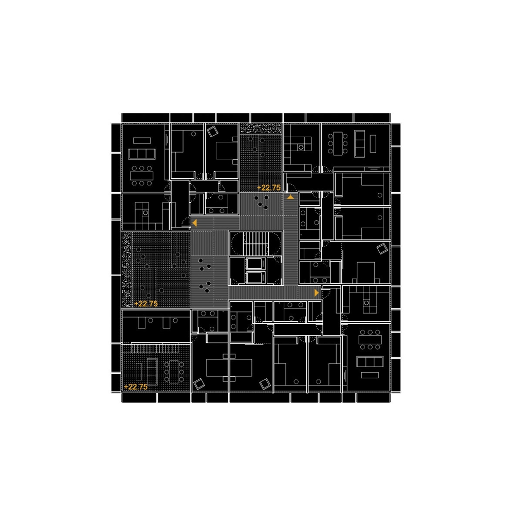 El edificio está dividido en tres partes. En el basamento se disponen locales comerciales con una altura libre de 5 m, se coloca alrededor de un espacio público verde, ligeramente hundido en el suelo y separado del tráfico y el ritmo de vida de la ciudad de Durban. El volumen intermedio está compuesto por la combinación de unidades de vivienda alrededor del núcleo central, con las escaleras y los ascensores. Al restar algunos elementos de esas unidades de vivienda, se crean nuevos espacios al aire libre, como jardines privados para los propietarios. Un edificio alto también debe tener la posibilidad de disfrutar de la naturaleza y los espacios abiertos. Desde esas terrazas, se puede ver la ciudad de Durban, su costa y puerto. En la parte superior del edificio es donde se colocan las áreas comunes, como la guardería, la piscina y el gimnasio. Nuevamente aparece una terraza, pero en este caso, abierta a la ciudad y al cielo.