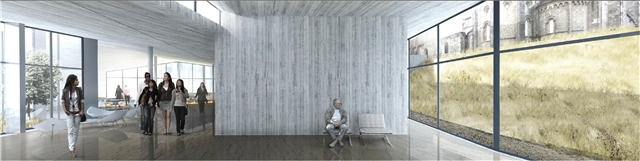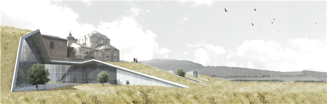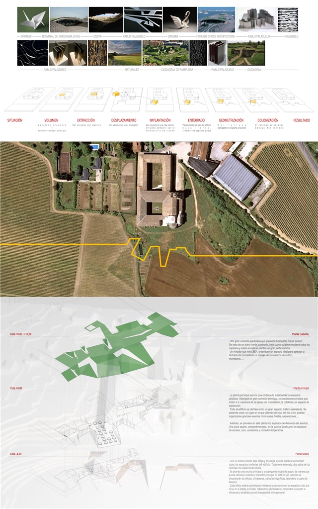 Un edificio sin edificio. Una intención clara de mantener el estado natural e histórico del monasterio de Irache, al mismo tiempo que se revitaliza una fachada trasera de gran calor arquitectónico.