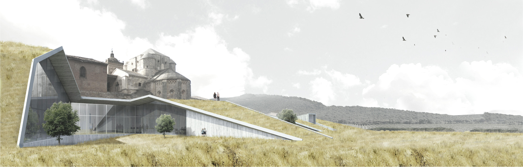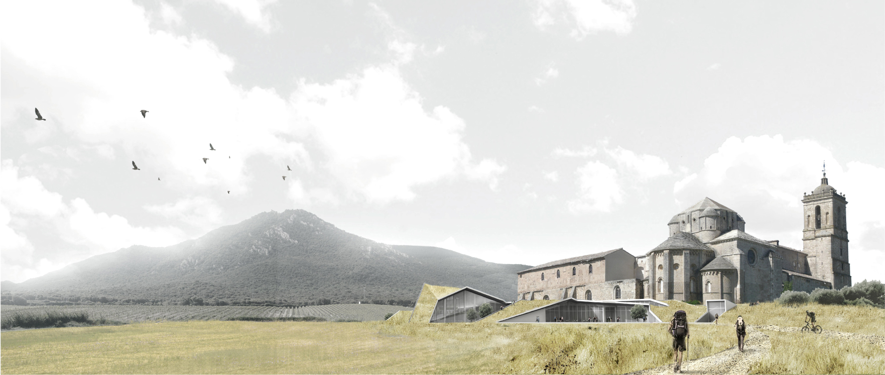 … como un origami gigante y ecológico, como una ensoñación de Palazuelo, quebrándose a los pies del monasterio de Irache, apenas asoma al paisaje una nueva volumetría