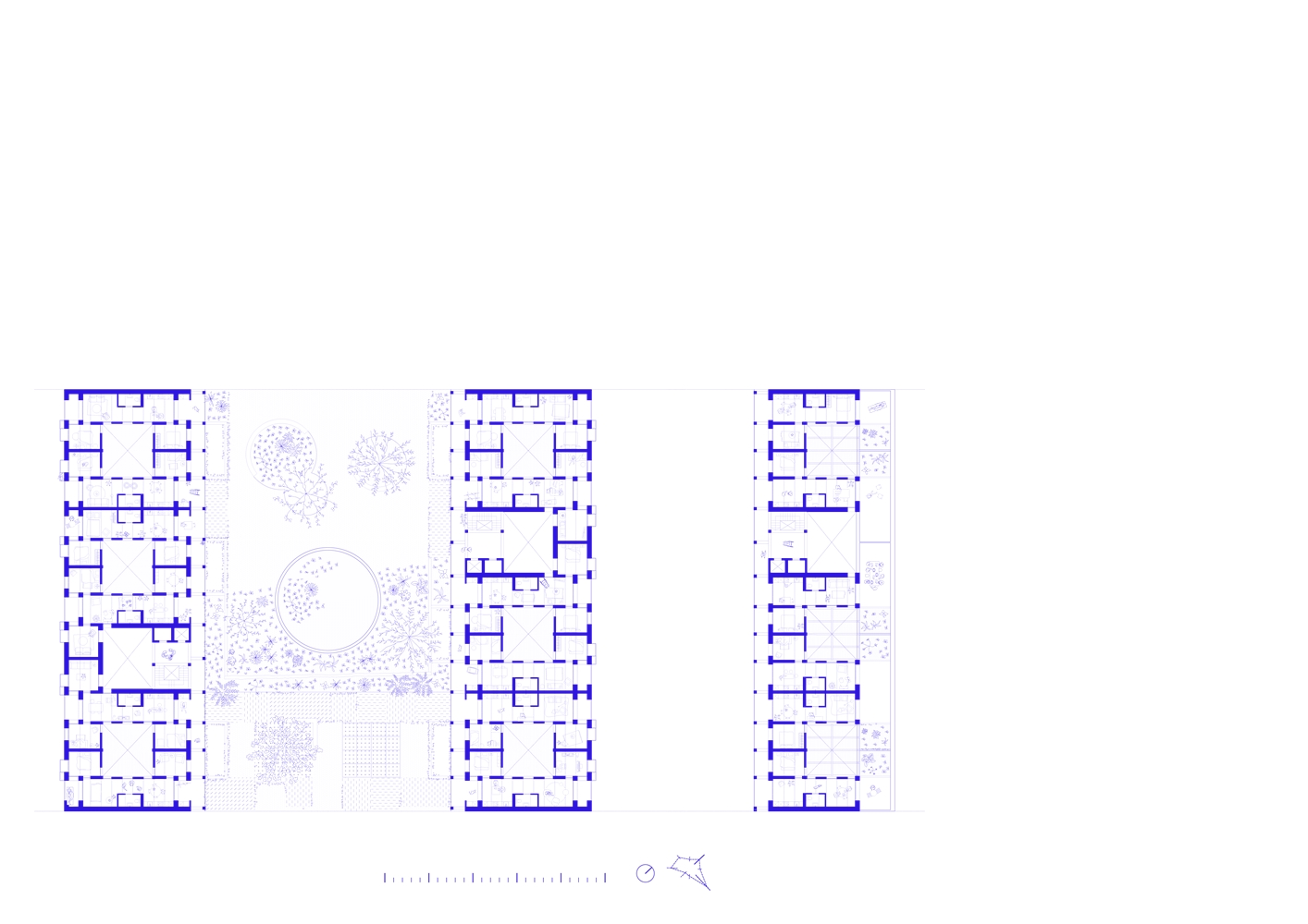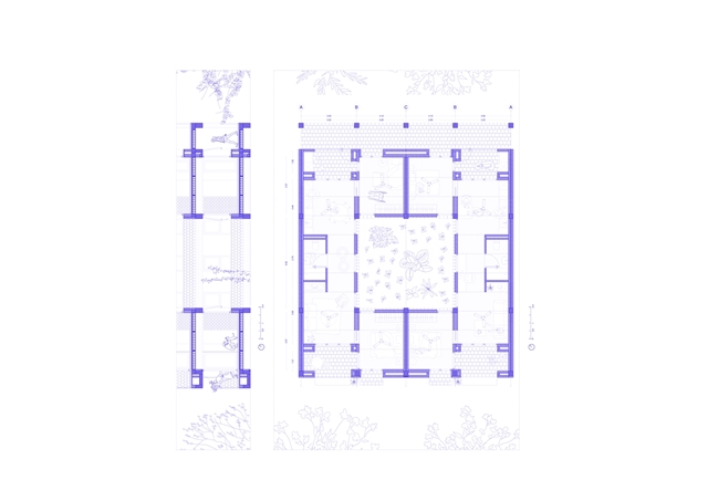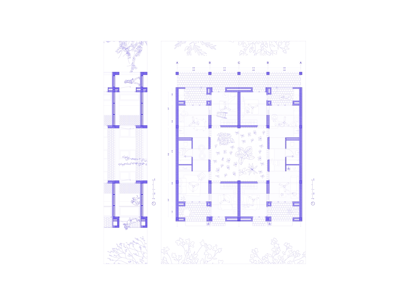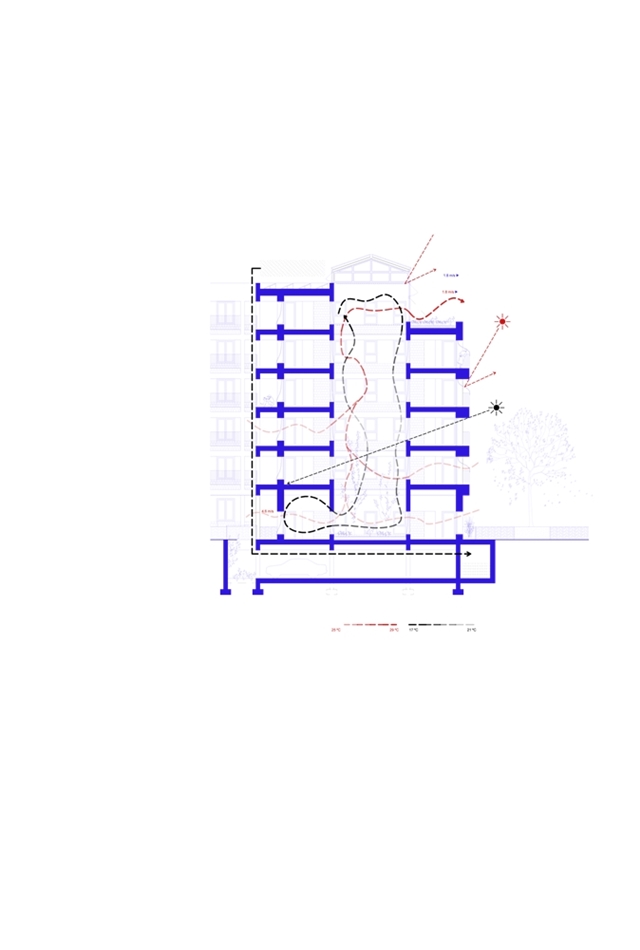 Con una profundidad edificable de 16 m, se considera conveniente la introducción de atrios alrededor de los cuales se organizan las viviendasen las plantas tipo, contribuyendo a la mejora de sus condiciones ambientales y facilitando su flexibilidad tipológica. En planta baja estos atrios disponen de vegetación y contribuyen a generar unos accesos y espacios comunes amplios, luminosos y confortables.