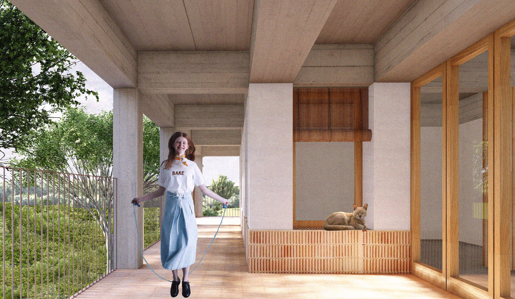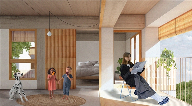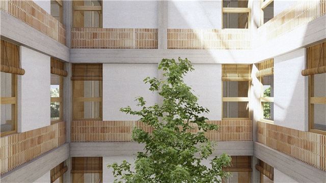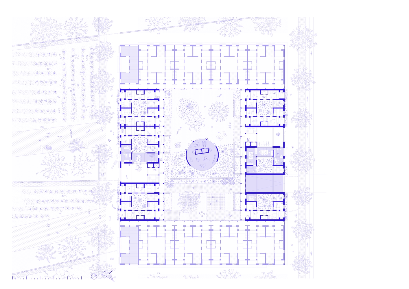 Partiendo de la vénta, la propuesta pretende actualizar ambos conceptos: una relación equilibrada con el territorio y una comunidad inclusiva y cohesionada. No se plantea el edifico como la suma de unidades de vivienda, sino como un conjunto coherente y versátil que constituye una escala de relación intermedia entre los habitantes y su entorno.