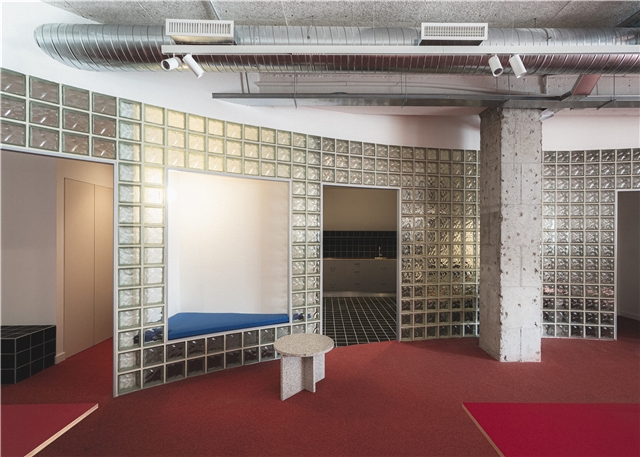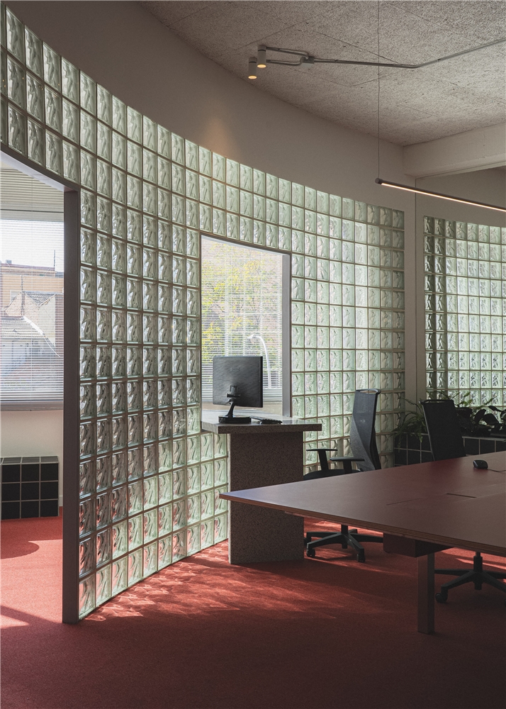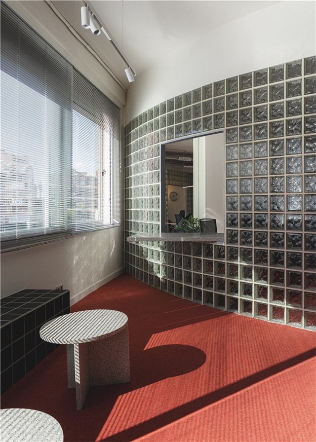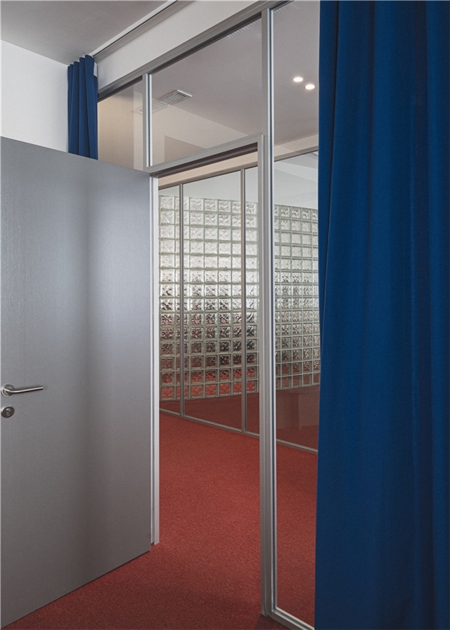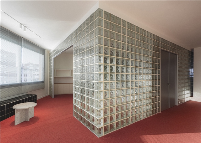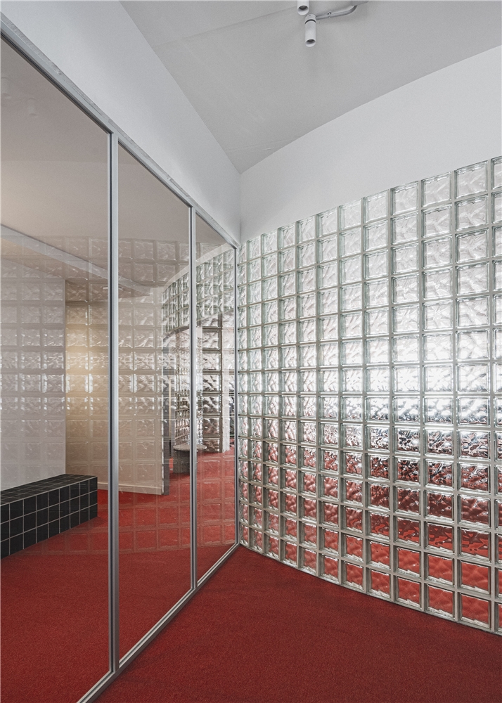 Curva y corte se materializan a través de muros de pavés: densos y translúcidos a la vez. Pedirle a la materia que confirme una idea previa, la geometría. Elementos que filtran la luz, insinúan presencias y permiten que el espacio se perciba como un todo continuo en su separación, y otros materiales reconocibles. Granito, alicatado negro, metales y una paleta contenida de rojos y azules no aparecen como signos, sino como condiciones. La identidad del lugar se construye desde la materia. Materiales que no se representan: operan. La materia deja de ser acabado para convertirse en estructura ambiental, en memoria activa que sostiene el espacio y lo vincula a una historia sin necesidad de nombrarla.