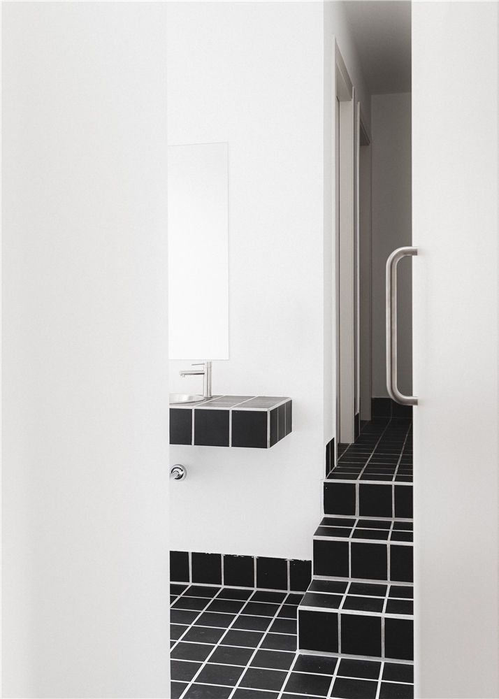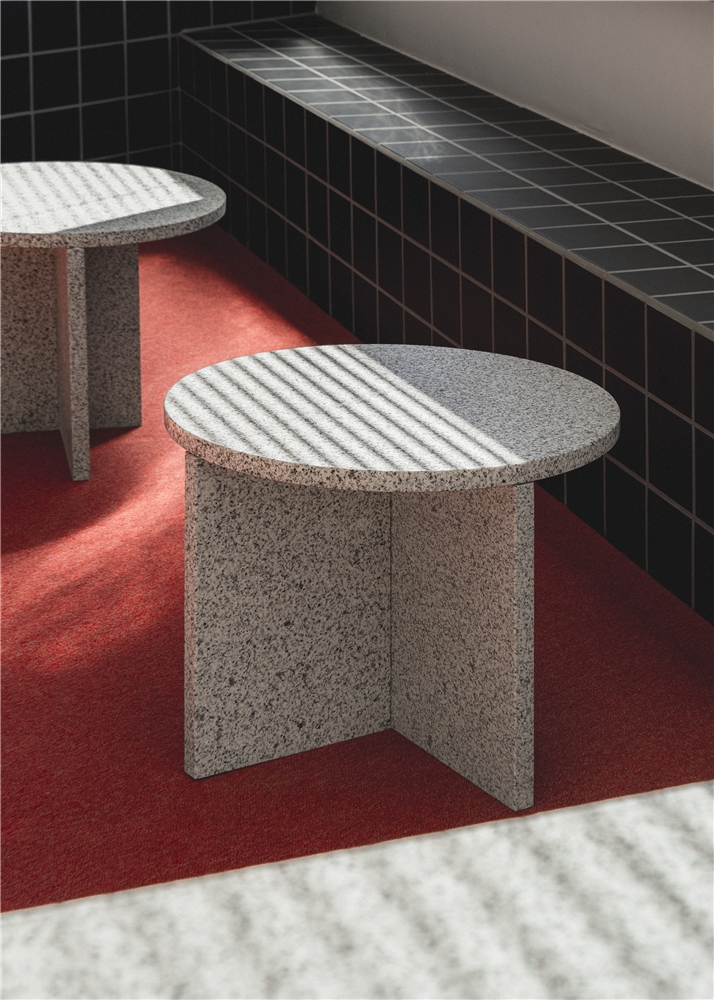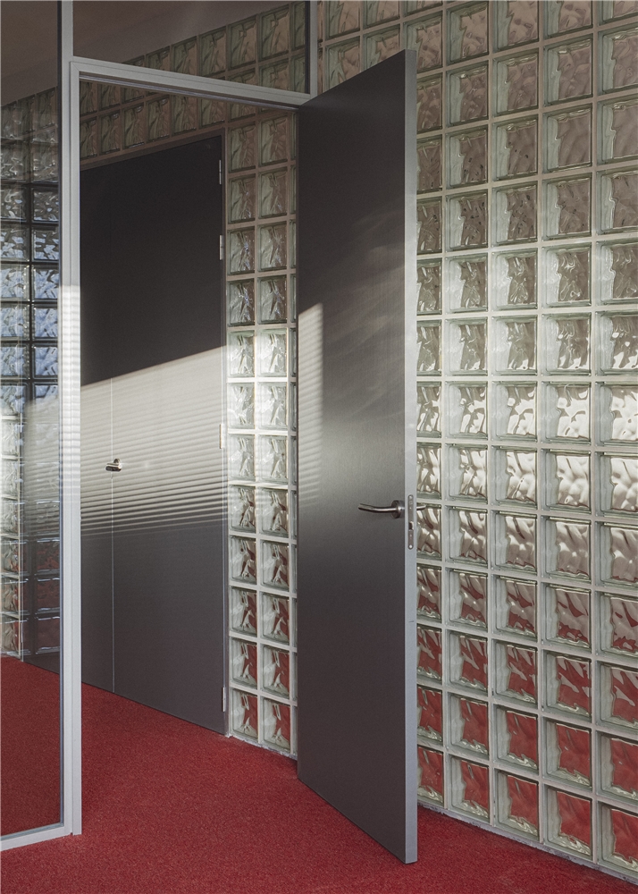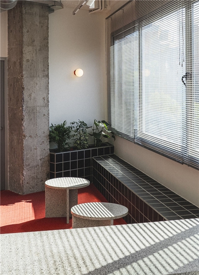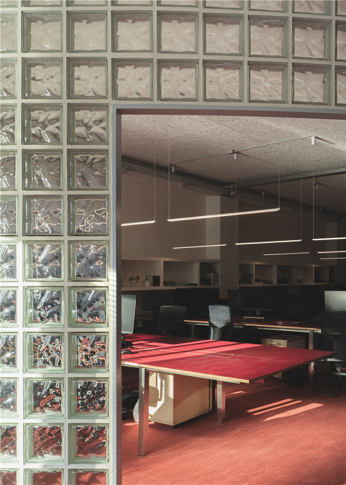 Curva y corte se materializan a través de muros de pavés: densos y translúcidos a la vez. Pedirle a la materia que confirme una idea previa, la geometría. Elementos que filtran la luz, insinúan presencias y permiten que el espacio se perciba como un todo continuo en su separación, y otros materiales reconocibles. Granito, alicatado negro, metales y una paleta contenida de rojos y azules no aparecen como signos, sino como condiciones. La identidad del lugar se construye desde la materia. Materiales que no se representan: operan. La materia deja de ser acabado para convertirse en estructura ambiental, en memoria activa que sostiene el espacio y lo vincula a una historia sin necesidad de nombrarla.