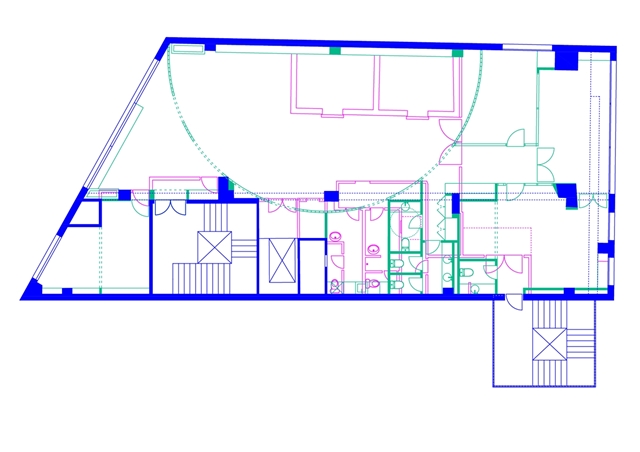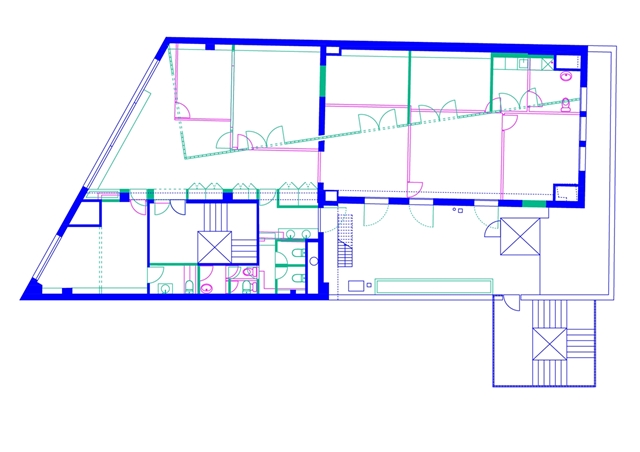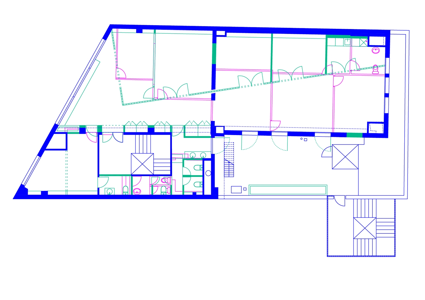 En la planta superior, el gesto se tensa. Un corte diagonal atraviesa el espacio y lo ordena desde la diferencia. Aquí, el trazo separa, delimita y define un interior dentro de él y un exterior fuera. Dentro, los espacios de concentración y trabajo individual. Fuera, un espacio sin programa capaz de absorber cambios, superponer usos y adaptarse a distintas intensidades de trabajo. El corte no fragmenta, sino que introduce una tensión productiva entre continuidad y barrera, entre proximidad y distancia.