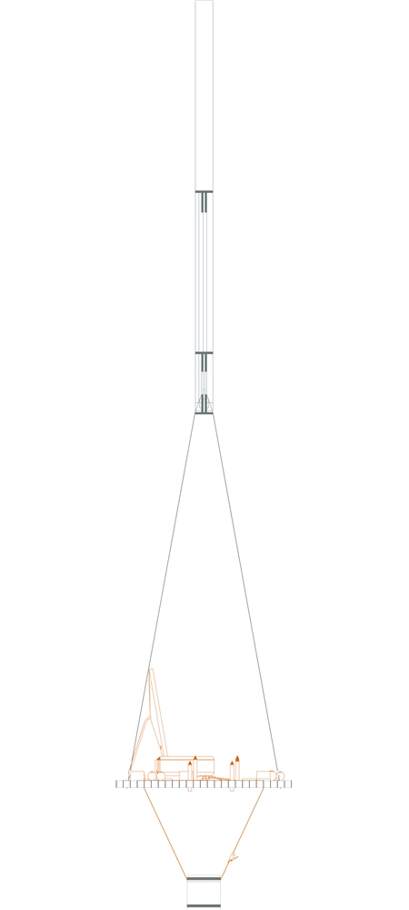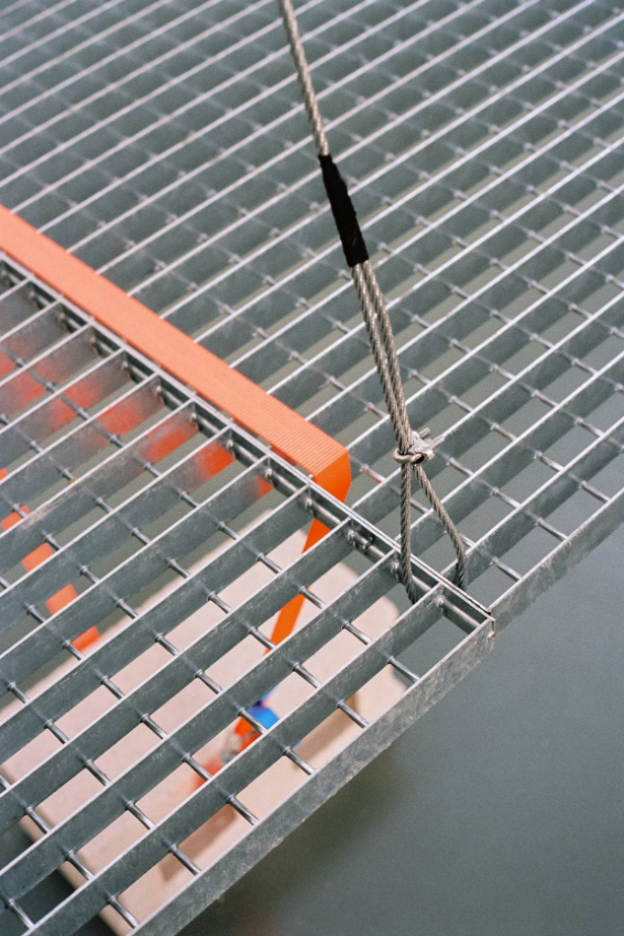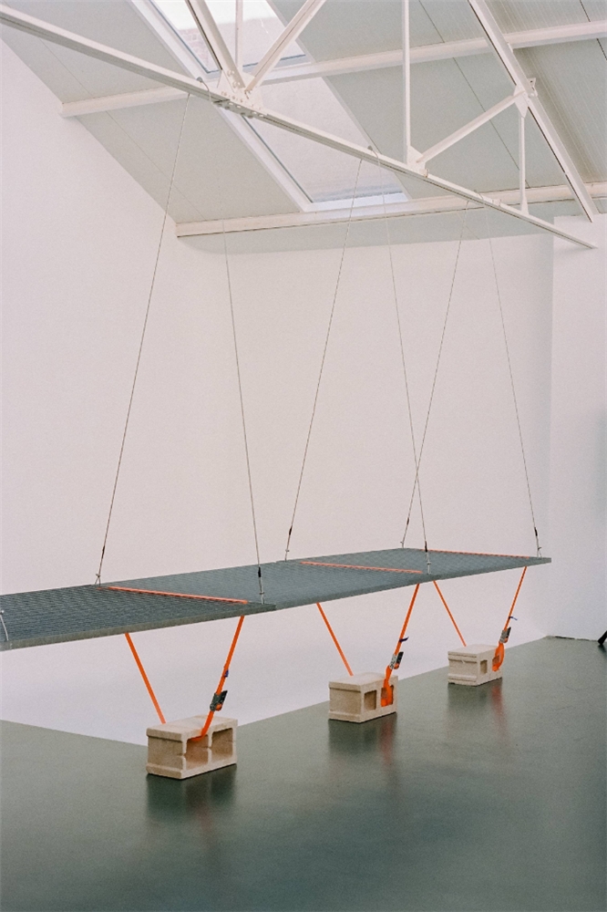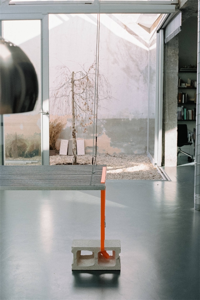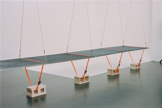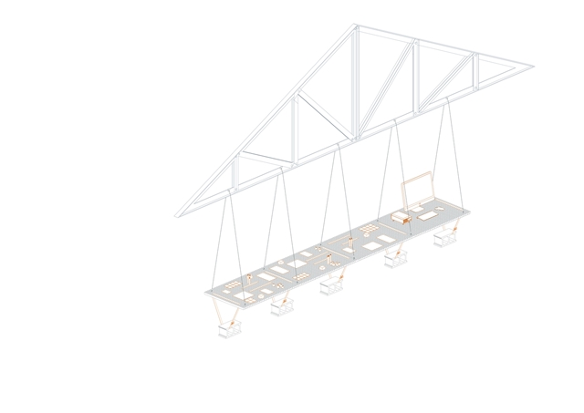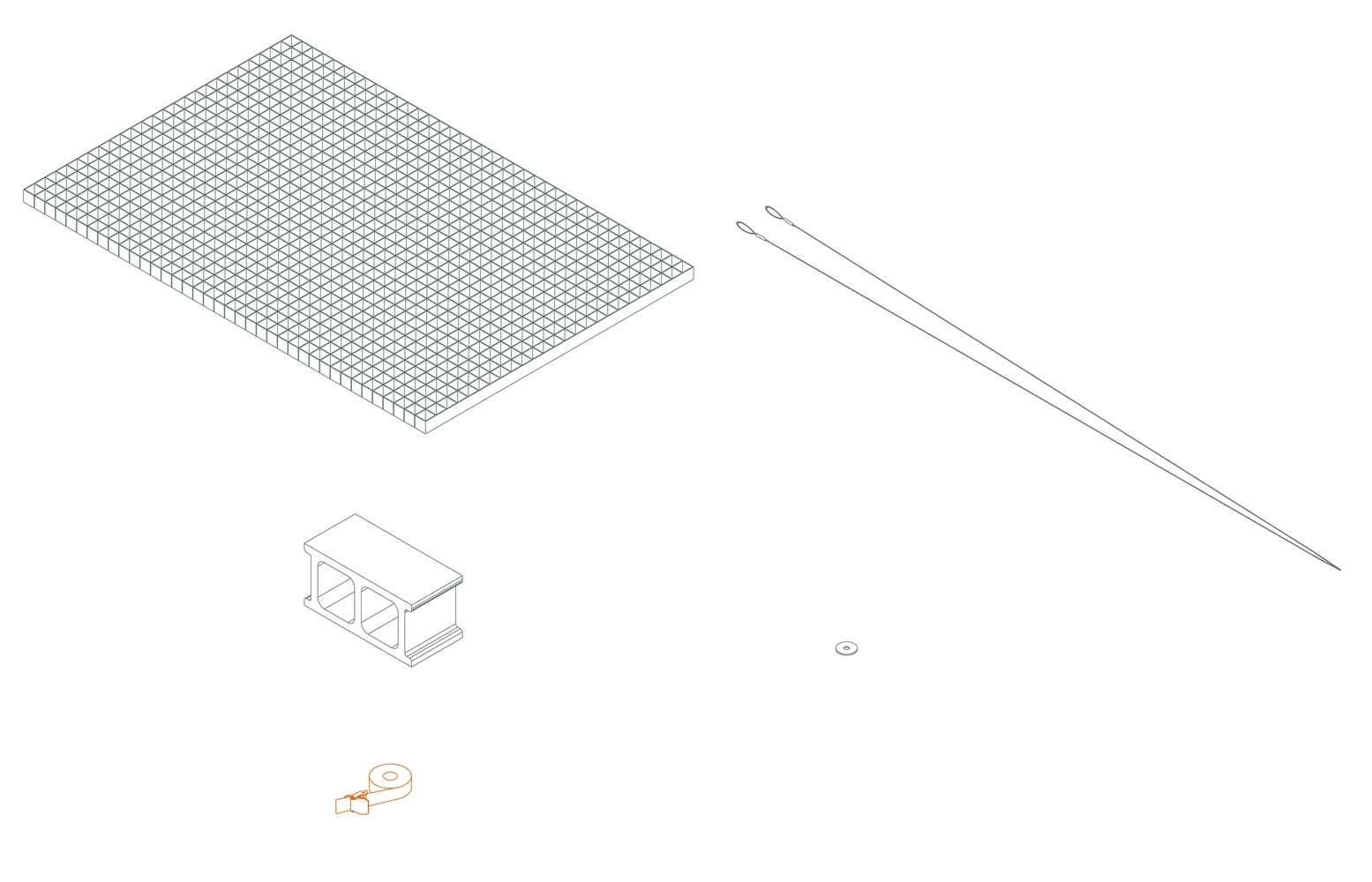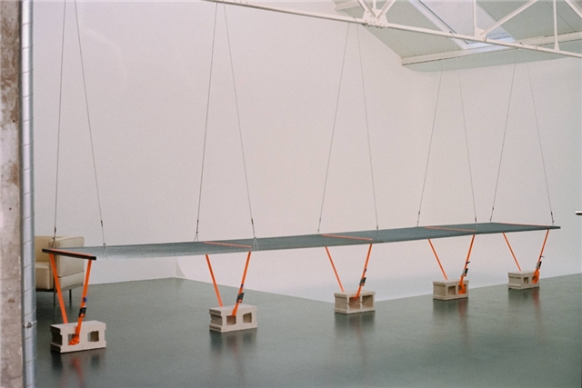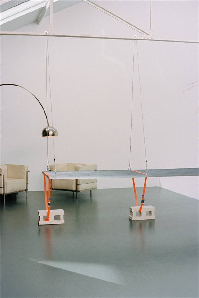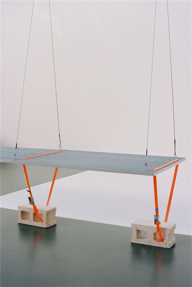 Esta, es la historia de un instante, un momento en el que ciertos elementos se juntaron para crear ese momento, y seguir con sus vidas después. Una cena alrededor de una gran mesa que duraría lo que durase este momento. Un momento, por favor. Unos bloques de hormigón que sobraron al construir ese muro, y unas planchas de tramex de una obra que aún no se van a instalar. La cercha. Con unos cables de acero colgamos las planchas de la cercha, y con unas cinchas atamos a los contrapesos que hacen los bloques, y en un momento, aparece lo que podría ser una mesa que no se apoya abajo sino arriba, un columpio con frenos de hormigón, que mañana será muro, suelo, o polvo. Una mesa eventual, sin morfología de mesa, enunciada en la suma de sus elementos, productos industriales ideados para otros fines.