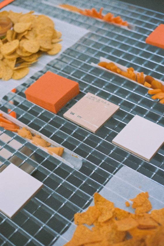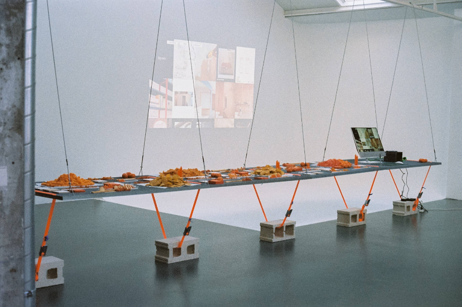 Una mesa con agujeros, no del todo práctica, no del todo cómoda, y que nos hace reflexionar sobre la comodidad, ese término construido culturalmente a través de las expectativas, rutinas y modas. Formas de evitar la necesaria fricción entre la arquitectura y el usuario. Por eso, de una mesa con agujeros, un menú para sus cavidades. Se comerá lo que no se cuele por sus agujeros o se ajuste a ellos, también lo que podamos apoyar sobre las baldosas que sobraron del baño, y que también sirvieron de carta de invitación. De la fiesta los nuevos restos, la cera de las velas naranjas derramadas sobre los bloques añaden una capa de historia en el camino de los materiales.