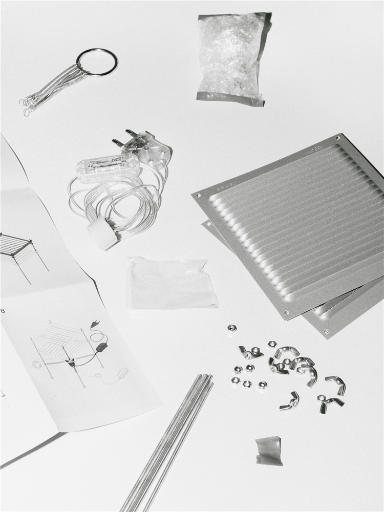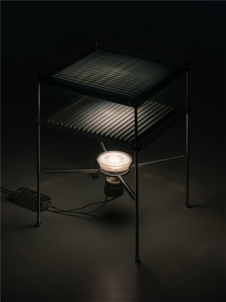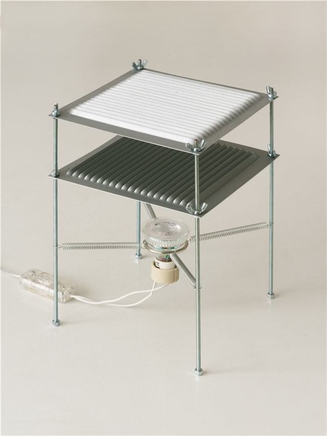 Rejillas de ventilación de catálogo, varillas roscadas, tuercas, muelles y un aro para colgar una cortina. Un objeto de materiales comunes pensados para otros fines y que, al ser desplazados de su contexto habitual, revelan otras capacidades.
