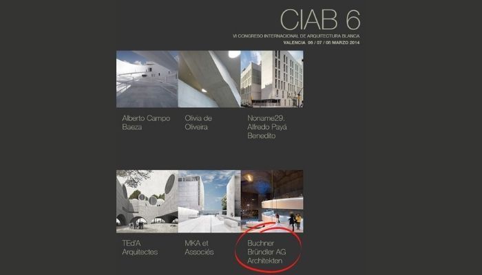 Conferencia del arquitecto Andreas Bründler celebrada el día 7 de marzo de 2014 dentro del 6º Congreso Internacional de Arquitectura Blanca (Valencia), donde presenta varios proyectos del estudio Buchner Bründler Architekten, lbaorados con hormigón, como por ejemplo la Loft House en Basel, la Binningen House o la Hertenstein House en Suiza.