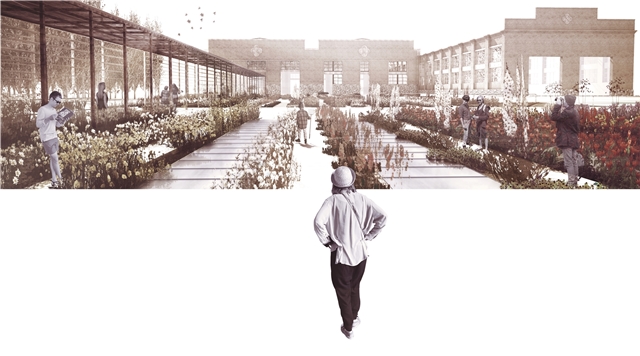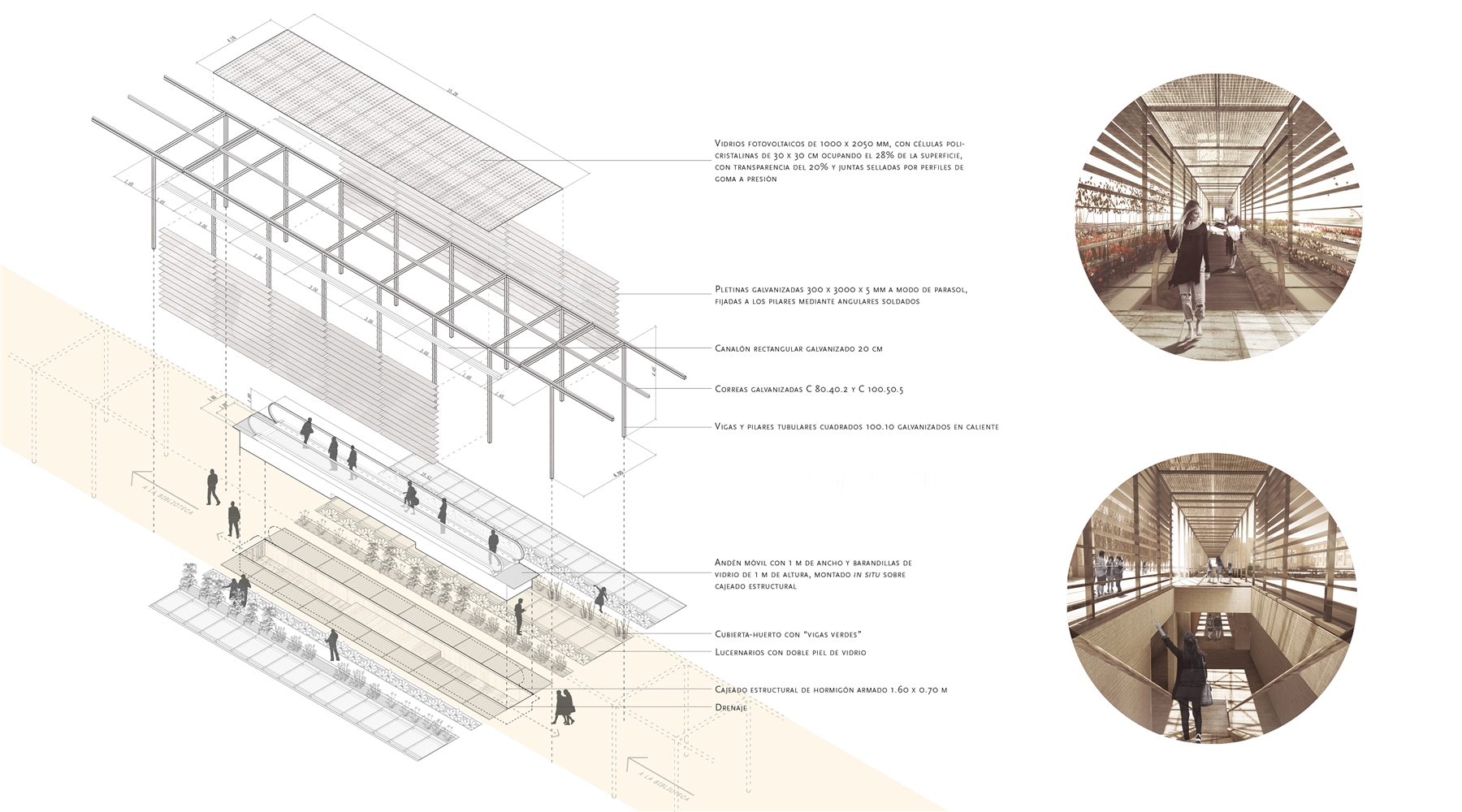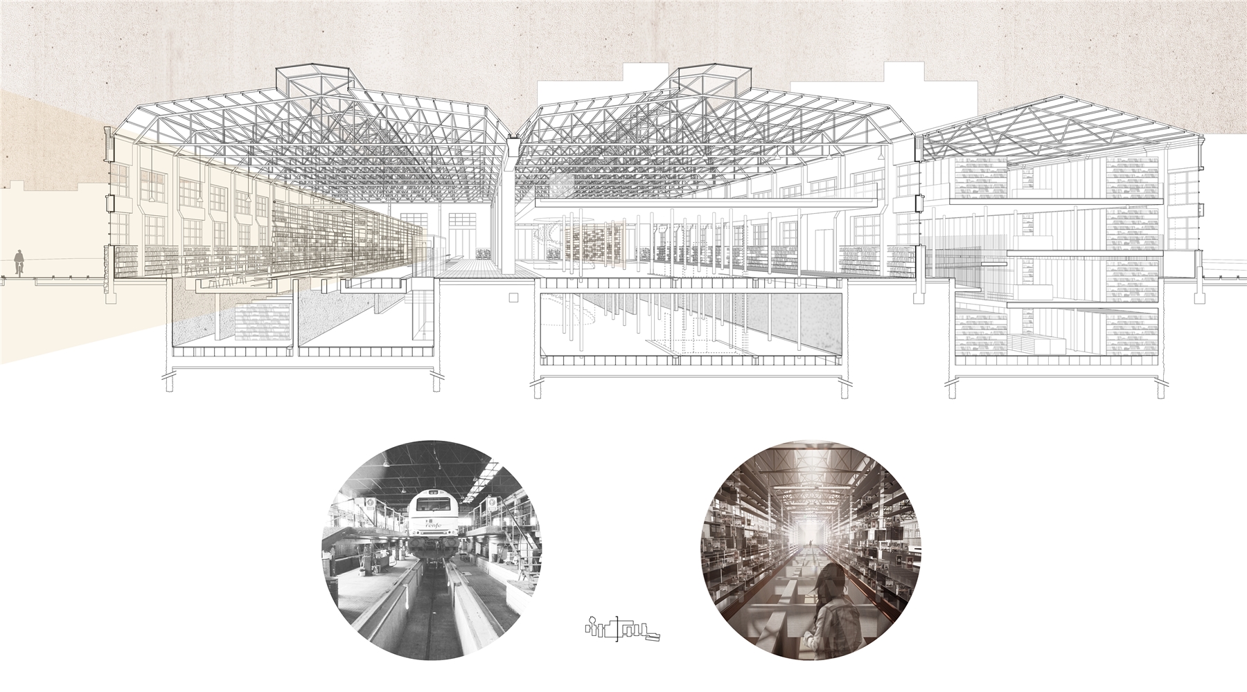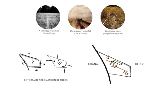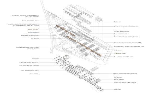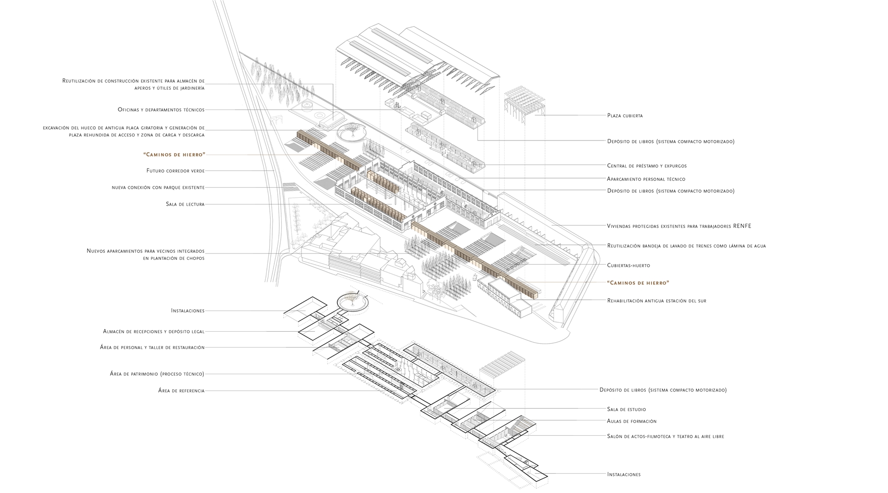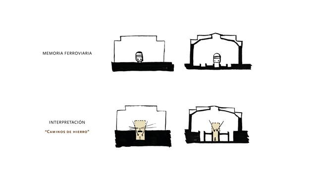El proyecto se apoya en las DOS VÍAS que acometen a las naves gemelas por sus vanos centrales: DOS LÍNEAS PARALELAS, CONTRAPUESTAS, ANTIMÉTRICAS, que permiten surcar la parcela desde uno u otro extremo y que conducen a las naves, donde se dispone el CORAZÓN DE LA BIBLIOTECA. La LINEALIDAD BIDIRECCIONAL inherente al mundo ferroviario permite un equipamiento “democrático” desde el punto de vista urbano, evitando dar el frente o la espalda a ninguno de ambos barrios. Y, a lo largo de estas líneas, durante el camino —como en todo viaje—, el protagonista es el PAISAJE.