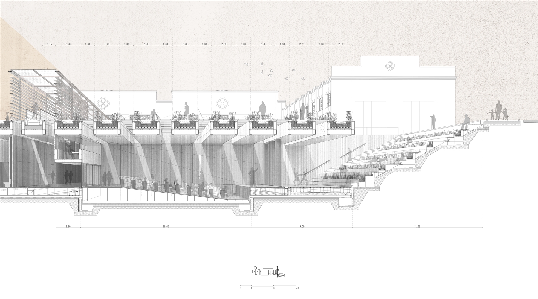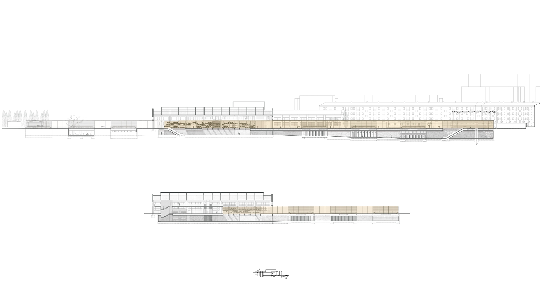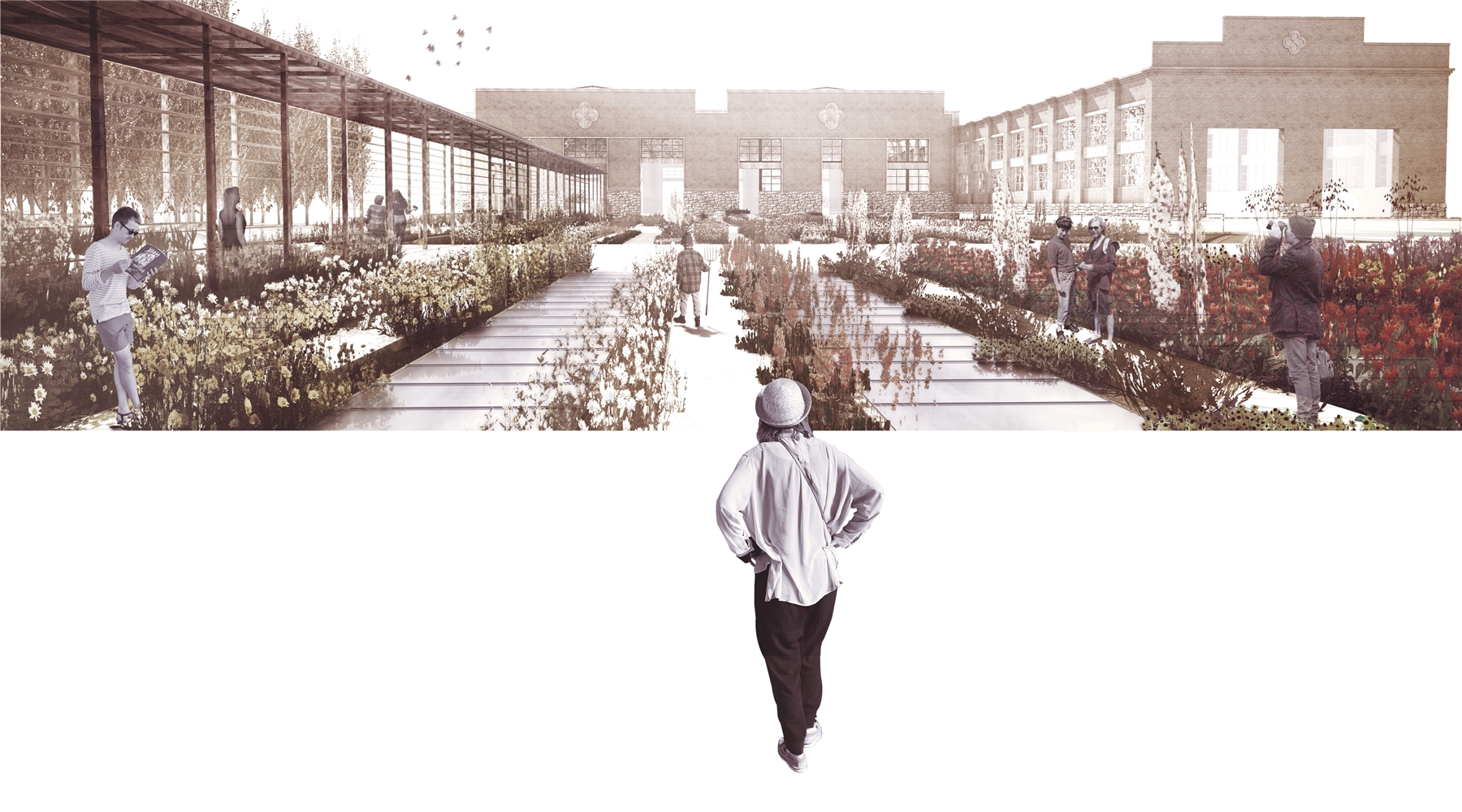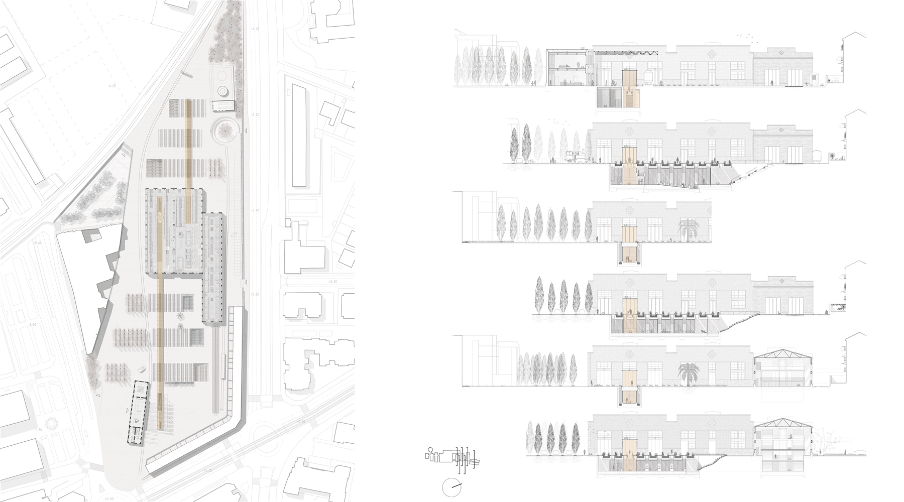 El proyecto se apoya en las DOS VÍAS que acometen a las naves gemelas por sus vanos centrales: DOS LÍNEAS PARALELAS, CONTRAPUESTAS, ANTIMÉTRICAS, que permiten surcar la parcela desde uno u otro extremo y que conducen a las naves, donde se dispone el CORAZÓN DE LA BIBLIOTECA. La LINEALIDAD BIDIRECCIONAL inherente al mundo ferroviario permite un equipamiento “democrático” desde el punto de vista urbano, evitando dar el frente o la espalda a ninguno de ambos barrios. Y, a lo largo de estas líneas, durante el camino —como en todo viaje—, el protagonista es el PAISAJE.