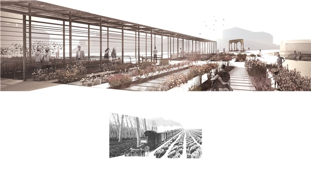 Un PAISAJE ORDENADO que potencia el cultivo de huertos urbanos espontáneamente existente en el lugar, que integra las estructuras ligadas al pasado ferroviario y proporciona el espacio público y los aparcamientos demandados por los vecinos.