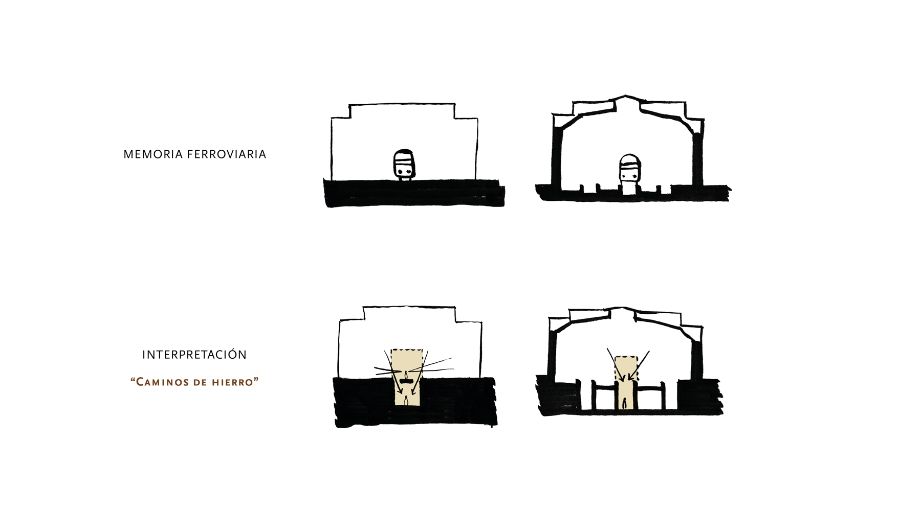 Las VÍAS encastradas en la parcela son huellas de MOVIMIENTOS AUSENTES, grabadas en el terreno por el paso insistente de trenes que ya no existen; movimientos que han condicionado la totalidad de los elementos del complejo: desde la situación de las naves de los talleres, sus dimensiones y portones al posicionamiento de la antigua estación y el resto de estructuras y maquinaria. En definitiva, primero fueron las vías y, después, todo lo demás.
