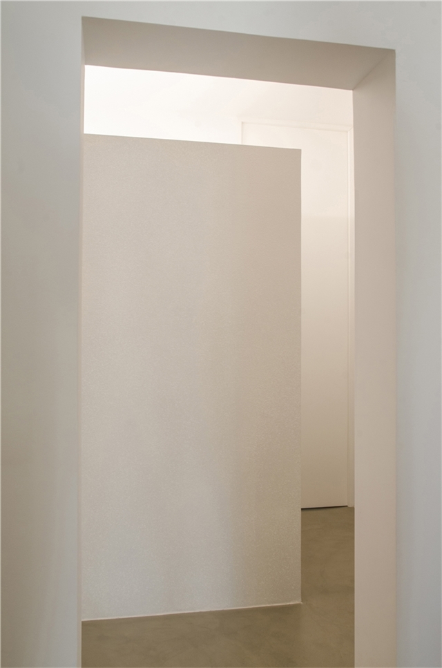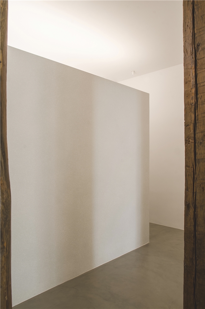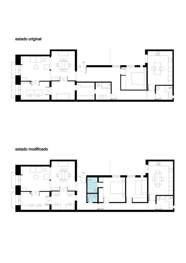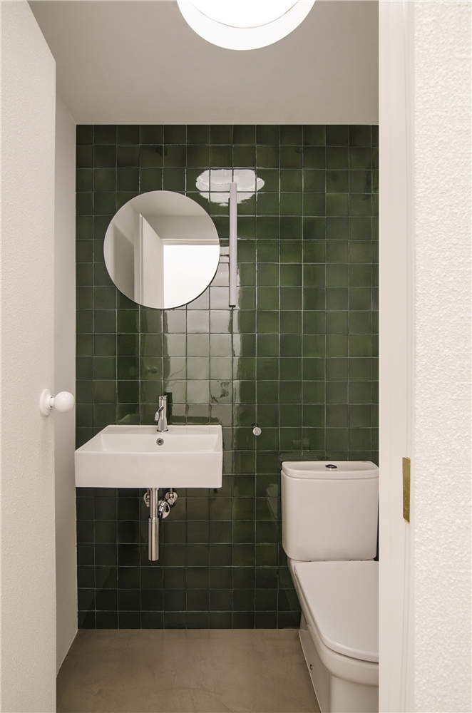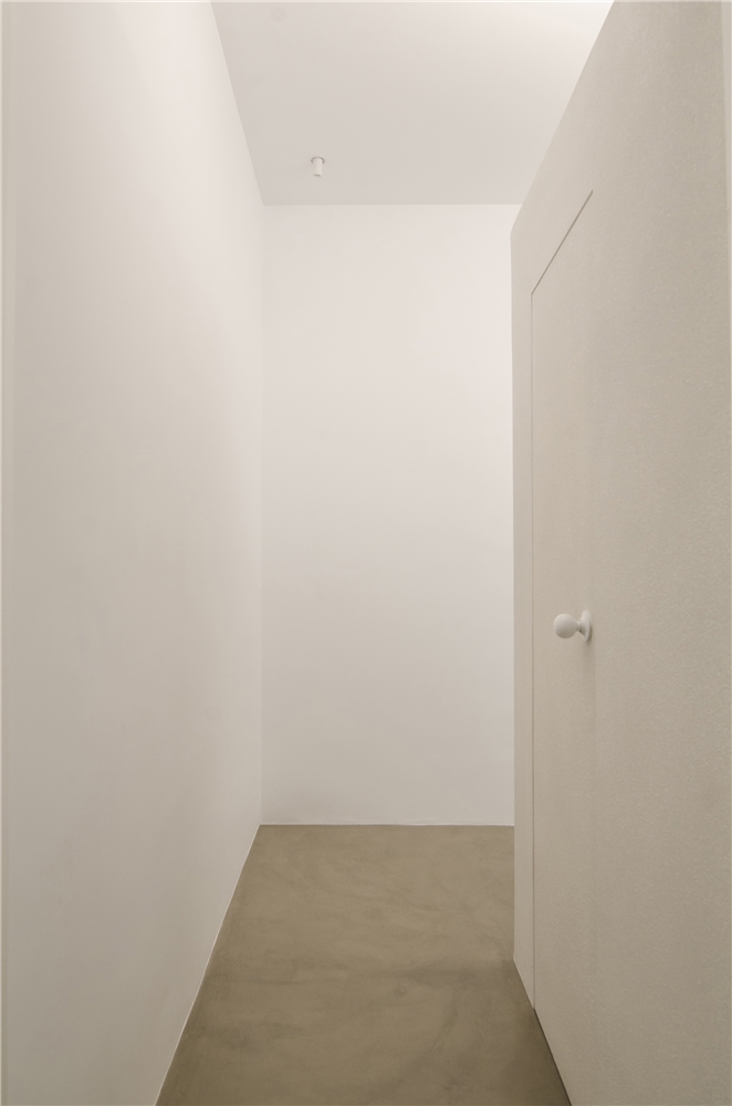 En este caso su piel exterior, a modo de constelación de puntos, se viste de gotelé. Se perfora en techo con formas circulares para introducir luz y tener un punto de respiro visual.