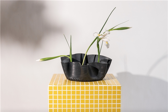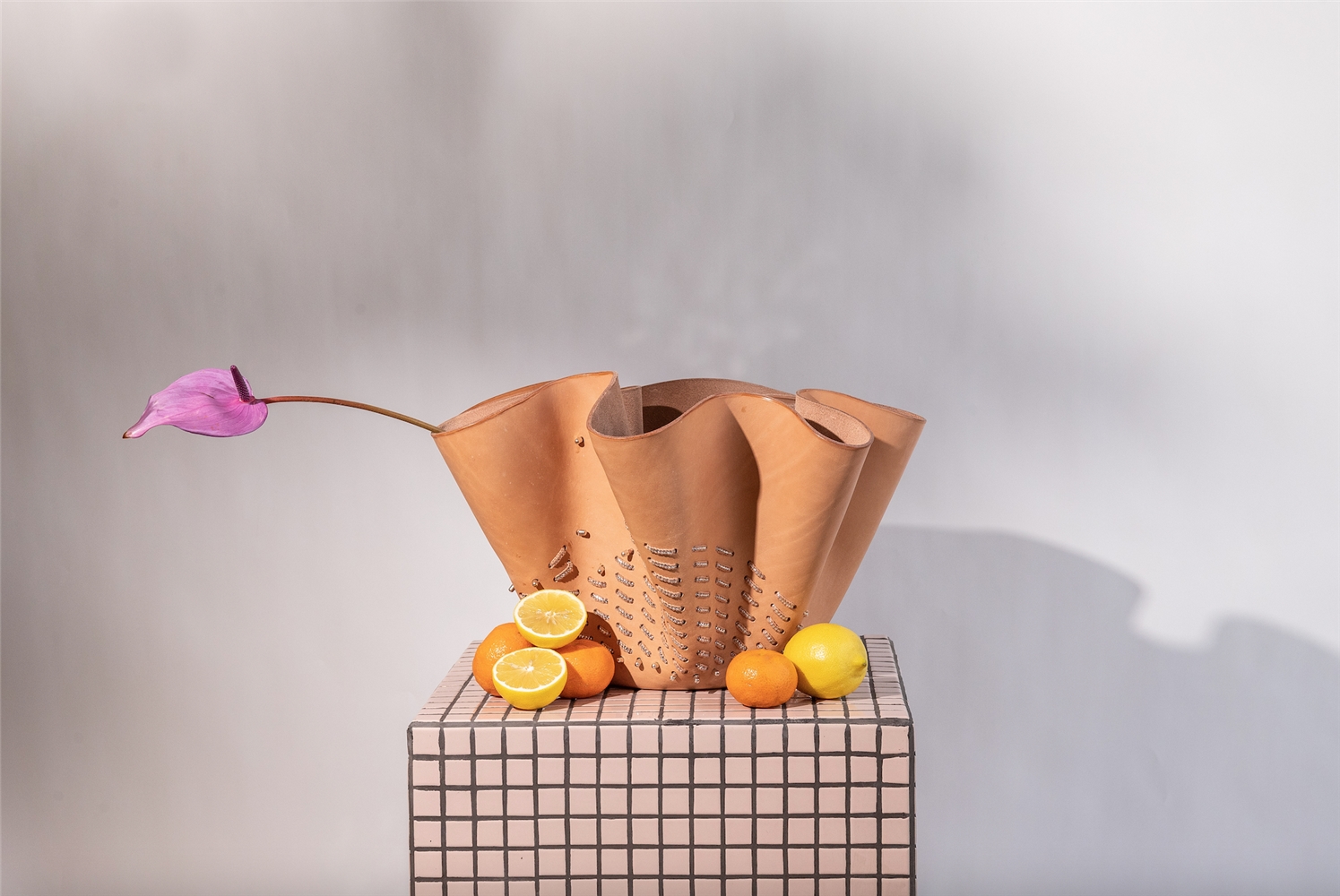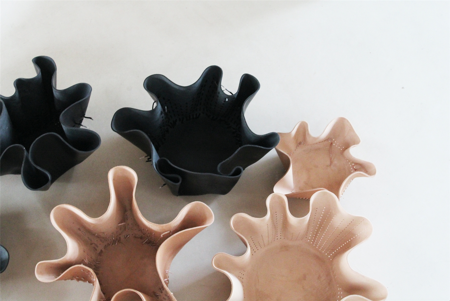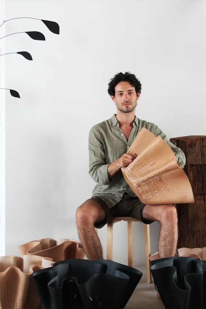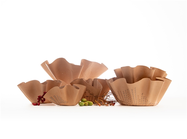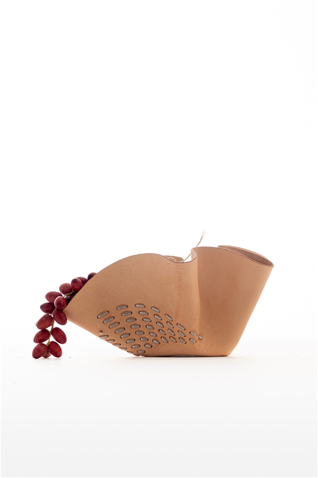“El objetivo del Irthi es elevar la artesanía tradicional local al mercado del lujo. Nuestro encargo era integrar en la piel, que representa a la artesanía ancestral Española, las pasamanerías talli que las artesanas Emiratíes dominan y reflejan su cultura. Nos inspiramos en las mujeres beduinas, que crean y usan este trabajo para decorar sus velos y vestidos de gasa. Esas texturas nos remitieron a clásicos como Bernini y Antonio Corradini y sus drapeados”. Traducir el movimiento de las esculturas de los italianos al cuero a través de la técnica del ahormado. “Consiste en mojarlo y que él mismo adquiera la forma en el proceso de secado. Nosotros lo dejamos caer sobre moldes cilíndricos para aportar una sensación de ingravidez. Cuando ya teníamos los fruteros, los perforamos haciendo dibujos y más tarde tejimos con talli. Queremos dar vida a los objetos, alma para que volvamos a empatizar con ellos, como lo hacemos con los seres vivos. Es una metáfora humana: el agua da vida a la piel”. Bajo el nombre Bringing objects into life, la colección consta de ocho piezas y se presentaron en el London Design Festival, Salone de Milano y la Semana del diseño de Dubai.