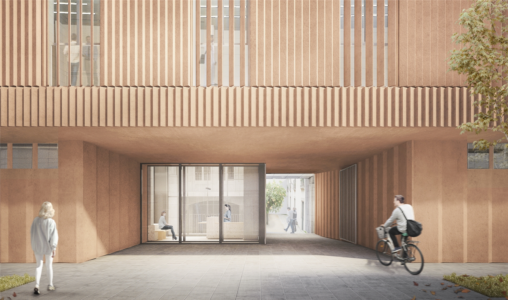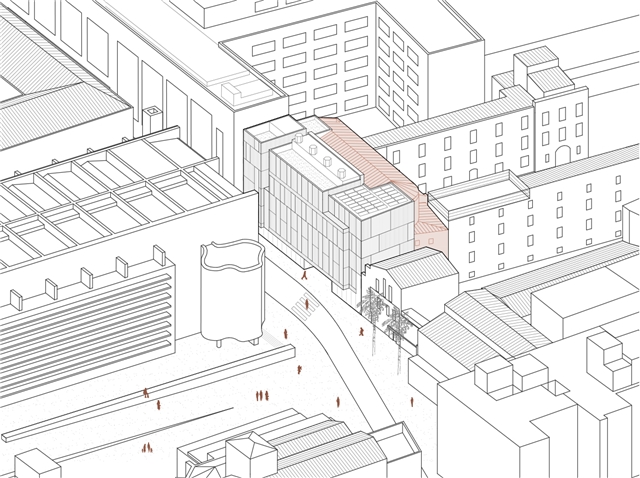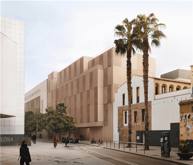 El nuevo edificio conforma un volumen que se va modelando para resolver una transición amable entre la escala contundente del edificio de la universidad o el MACBA y el edificio de menor envergadura de la escuela Vedruna. Tanto la disposición de aberturas de la nueva fachada como el cromatismo propuesto tratan de integrarse con la proporción vacío-pleno del entorno y las tonalidades predominantes en el casco antiguo.