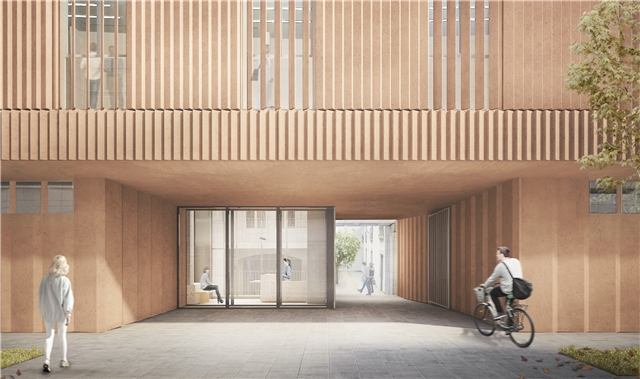 Las proporciones del hueco propuesto en planta baja de la nueva entrada junto al pasaje existente a mantener le otorgan la escala apropiada en relación al tejido urbano de la calle Montalegre.