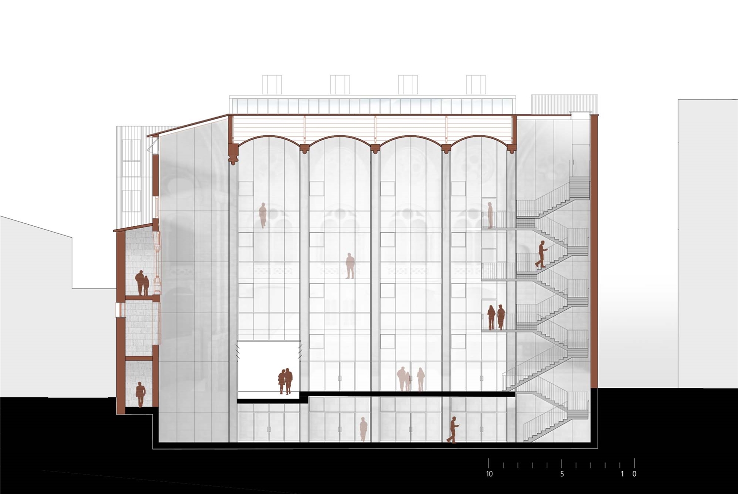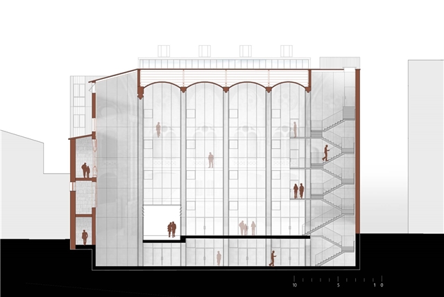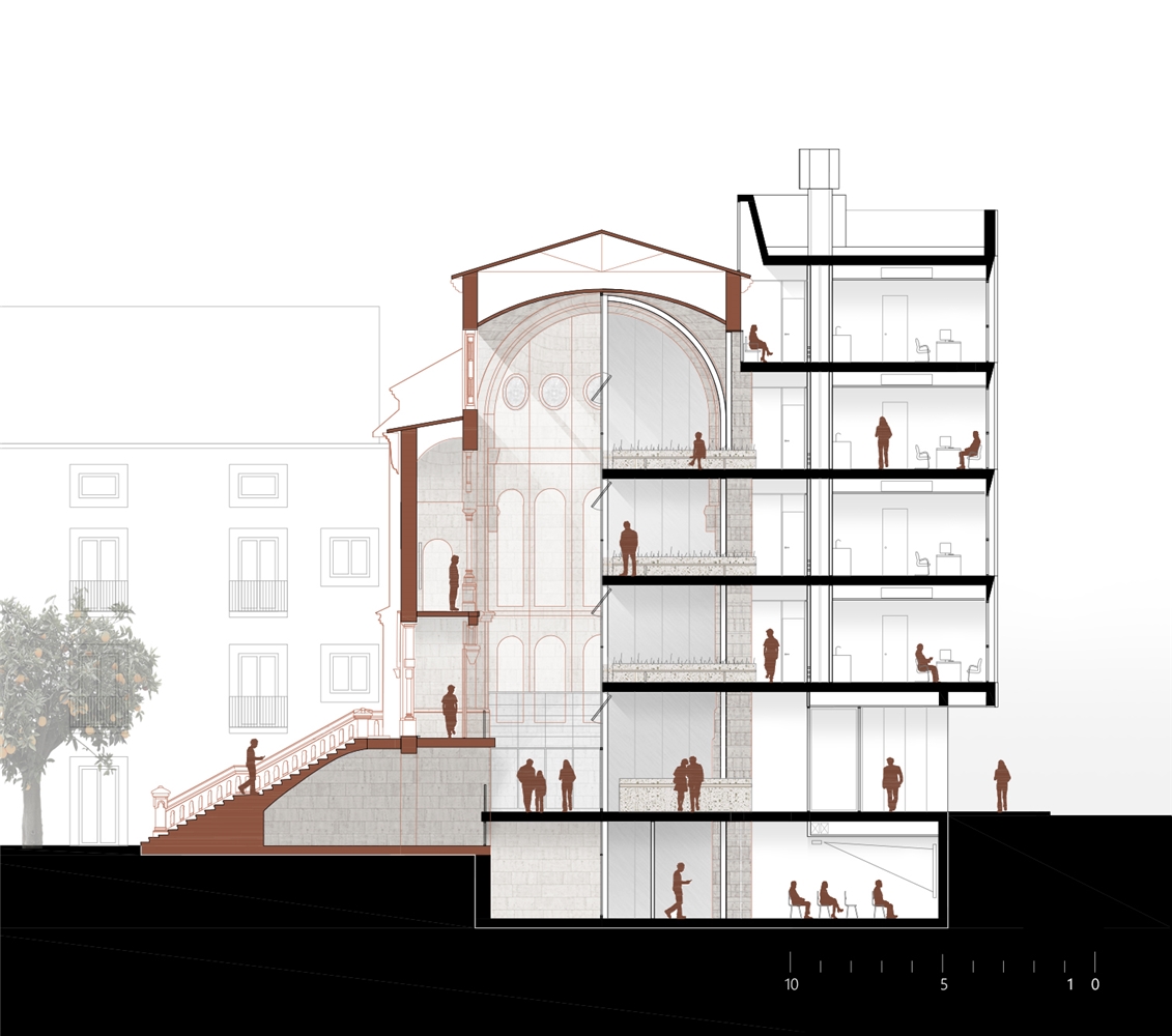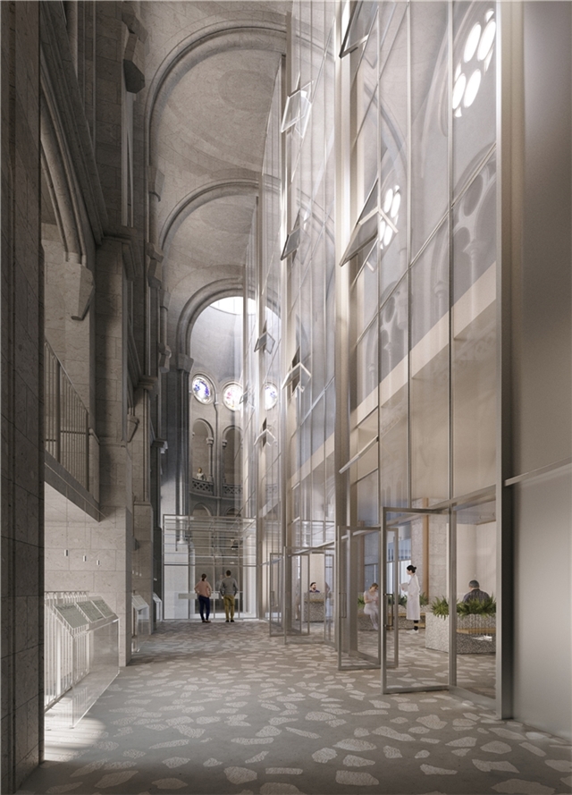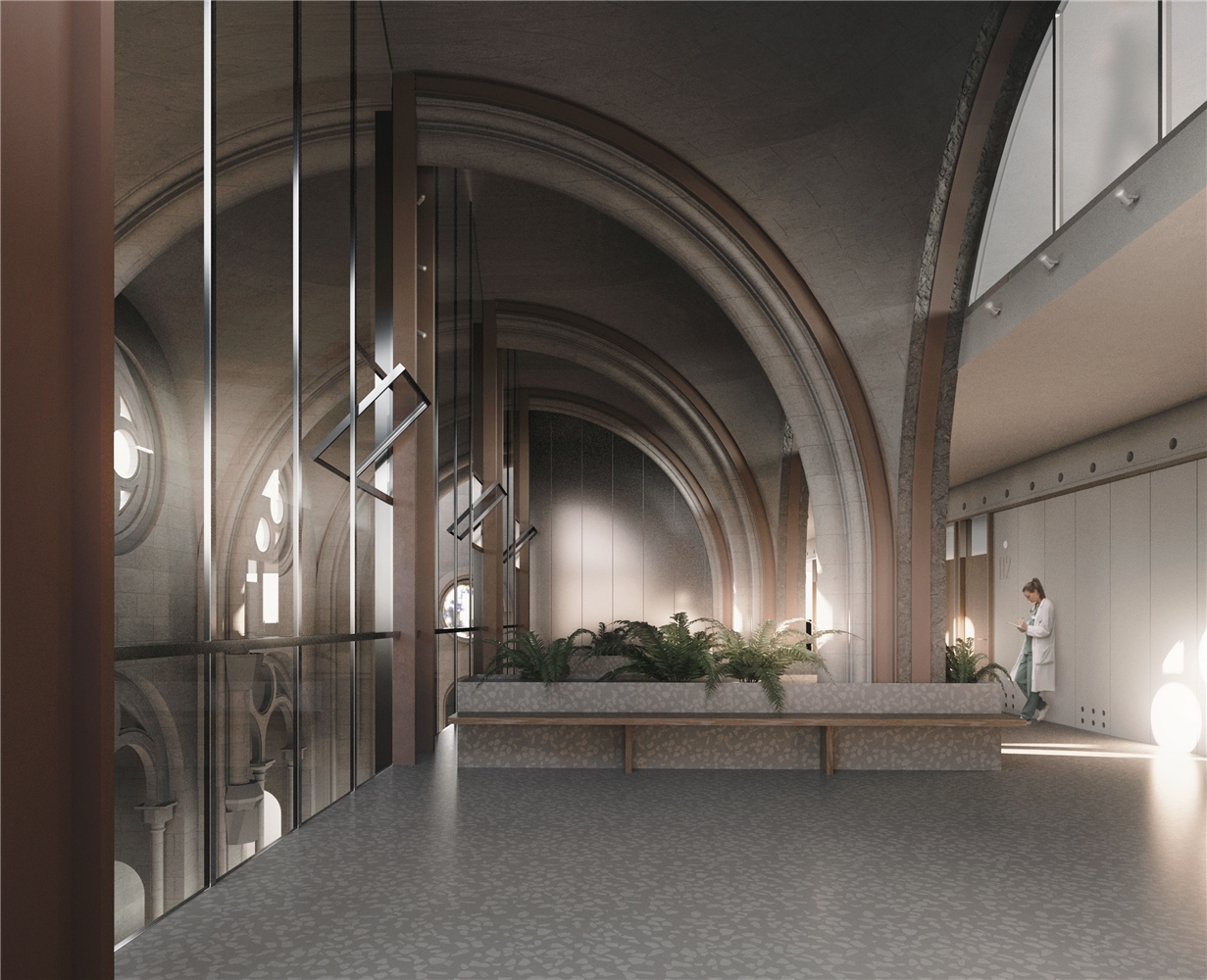 - La fachada interior, protegida por el espacio bioclimático de la iglesia, controla el intercambio, tanto energético como visual, con el espacio de la iglesia a conservar. Aprovechando esta condición singular se propone una materialidad transparente y ligera, potenciando la entrada de luz natural. Pero también reflectante, poniendo en valor el patrimonio arquitectónico conservado. Las proporciones de los elementos están diseñados para conseguir un buen diálogo con la escala del alzado interior de la iglesia. Las aberturas permiten renovar el aire cuando sea necesario.