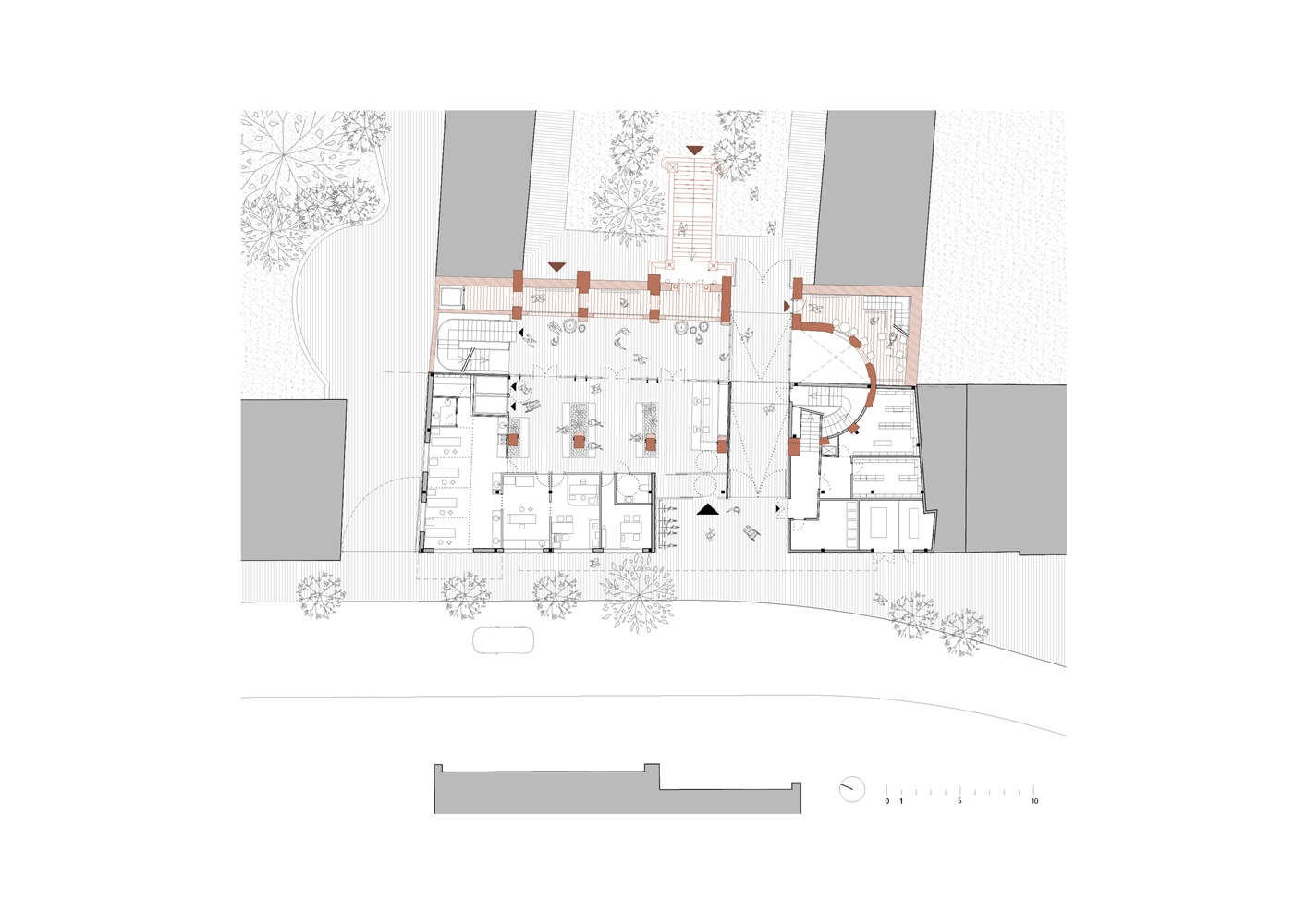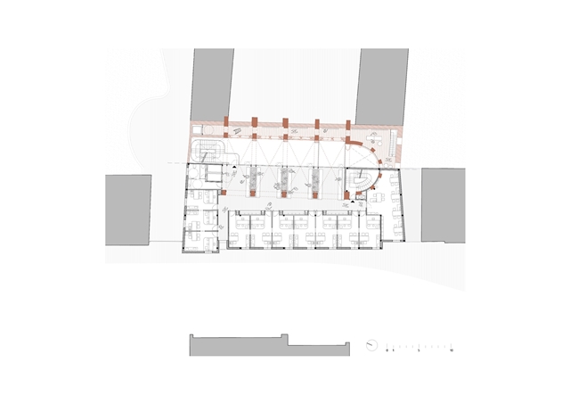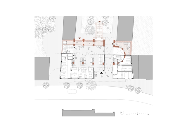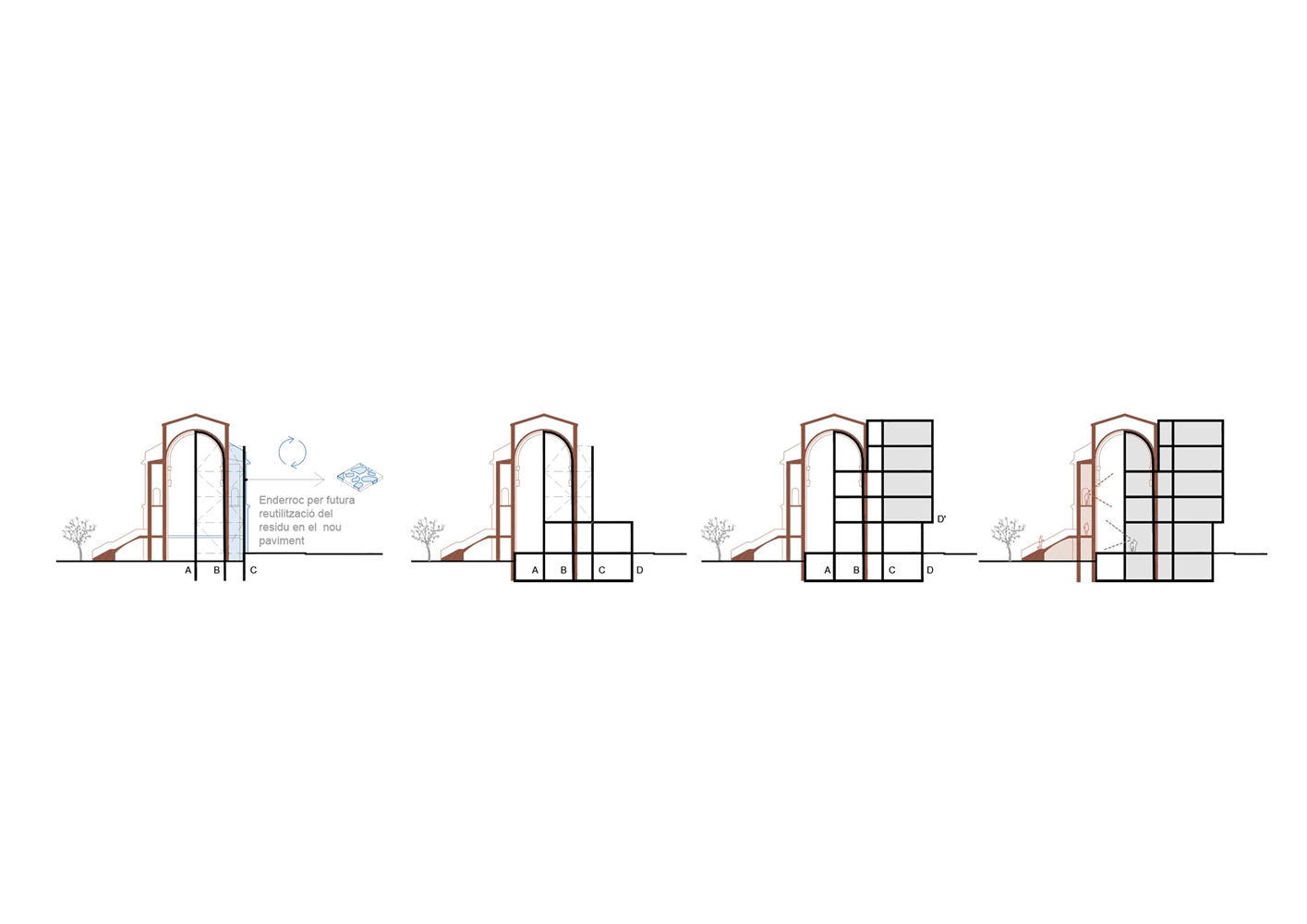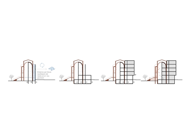 3. Se aprovecha la condición de conservar parte de la iglesia para resolver el encaje de la misma dentro del tejido urbano y social del barrio ofreciendo la posibilidad, con una intervención mínima, de apropiarse de la parte no ocupada por el nuevo CAP y reutilizarla como nuevo espacio de actividades ciudadanas;