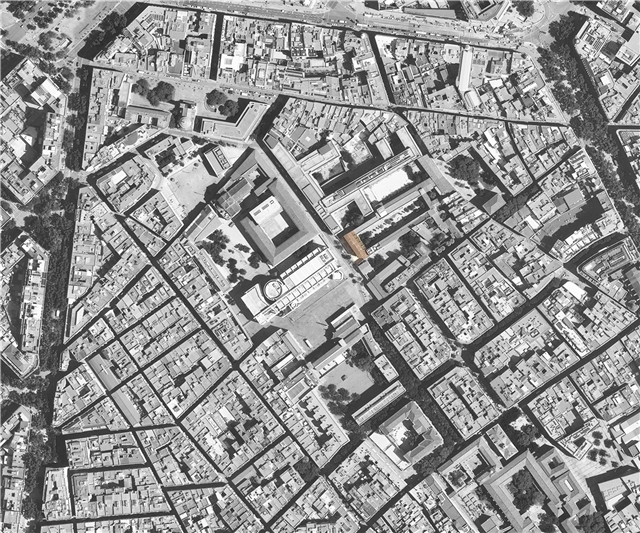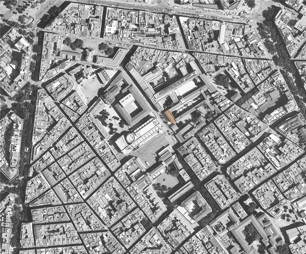 La capilla existente no está protegida y se considera que no tiene un valor patrimonial destacable, pero se pide mantener, por lo menos, una de sus fachadas. Además, no se permite incluir programa del nuevo equipamiento en la mitad del volumen actual de la capilla, resultando una parcela construible muy estrecha y completamente condicionada por la preexistencia y el peso simbólico e histórico del emplazamiento.