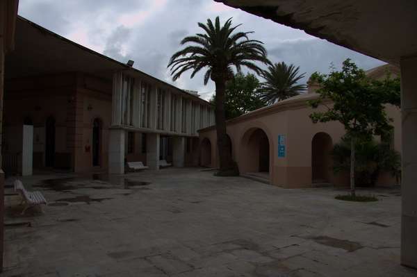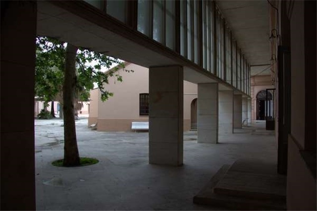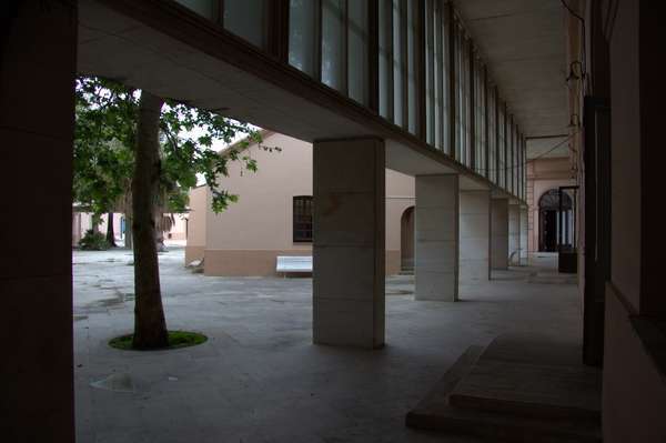 El tratamiento del espacio central queda determinado por la posición del pórtico que se anexa al edificio este del lado sur, ya que éste se extiende sus pilastras inferiores en dirección noroeste hasta tocar el lado opuesto del patio, consiguiendo así encerrar la edificación exenta preexistente, que se destina a uso administrativo. El espacio resultante entre el pórtico y el lado nordeste del fuerte consigue así unas dimensiones controladas, y sirve de patio principal del conjunto, dando acceso a los espacios expositivos localizados en el antiguo baluarte.
