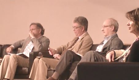 Tercera Taula, "Divulgació" presentada per Miquel Corominas, DUOT, ETSAB, amb les intervencions de Josep Ramoneda, Filòsof, Barcelona; Lluís Doménech, Arquitecte, Barcelona; Pier Luigi Nicolin, Politecnico Milano; Ariella Masboungi, Urbanista, França; Enric Satué, Dissenyador gràfic, Barcelona. A la fila zero: Antoni Marí, Dept. Teoria de l'Art, UPF; Rob Krier, Arquitecte, Luxembourg; Fernando Marzá, Vocal Cultura del COAC; Xavier Monteys, Dept. Projectes ETSAV; Manolo Laguillo, Fotògraf, Zaida Muxí; Fernando Villavecchia, Dept. Projectes Barcelona. Interpretació musical: "Escenes d'infants. Jeunes filles au jardin" de Frederic Mompou. (720x576). 2099.2/3088
