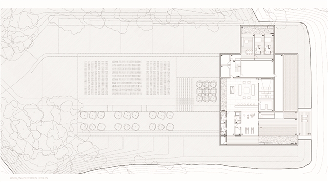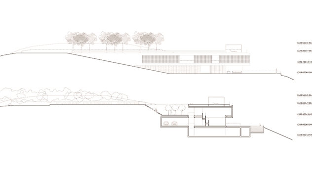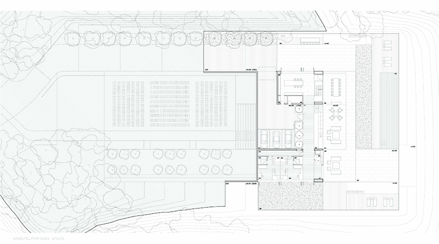 El nivel de cubierta, que coincide con la cota más elevada de la parcela y por tanto con excepcionales vistas sobre el paisaje que nos rodea se transforma en un gran jardín de bienvenida que el visitante debe recorrer rodeado de elementos de agua, arboledas o pequeñas plantaciones.