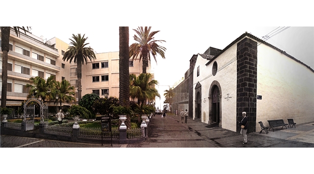 Desde el exterior, el edificio aparece como un volumen neutro de color oscuro, casi negro. Del color de la arena de las playas y las rocas que configuran el espectacular paisaje del Puerto de la Cruz. El proyecto no trata de relacionarse con su entorno residencial más cercano, pero sí con la materialidad de la torre de la contigua Iglesia de San Francisco y con el territorio natural.