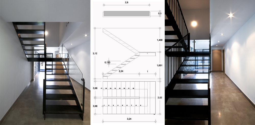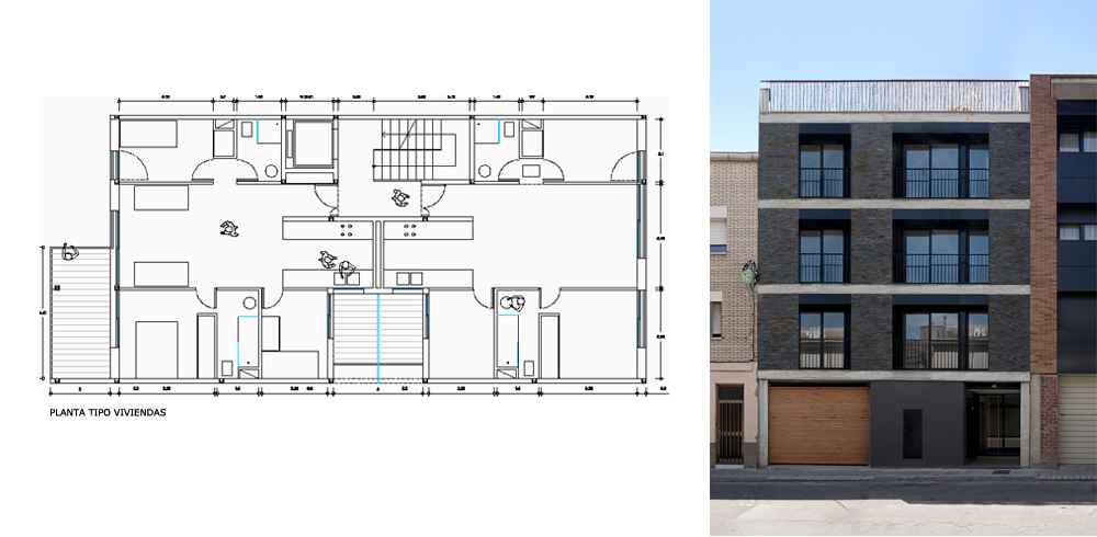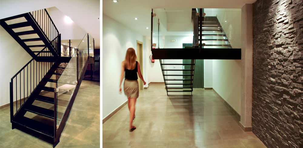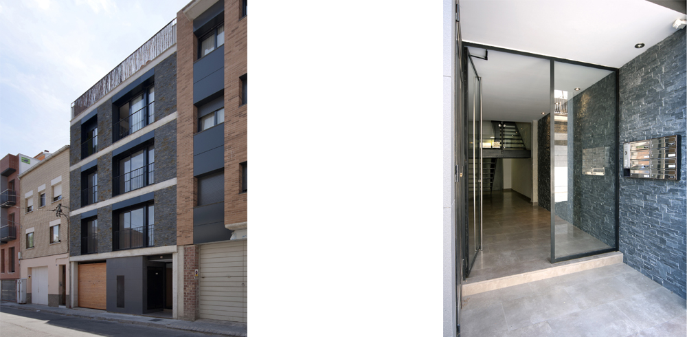 se requiere una doble solución en planta con viviendas de dos o tres habitaciones. para optimizar metros cuadrados, se eliminan los pasillos usando la sala como un gran espacio común. los forjados de hormigón conforman la fachada, cuyos cerramientos son de piedra natural y cristal. la puerta de madera del garaje es reciclada de una construcción anterior existente en el solar. una escalera metálica colgada mediante tirantes permite la visibilidad y luz en todo el vestíbulo, evita la creación de rincones y dignifica la entrada.