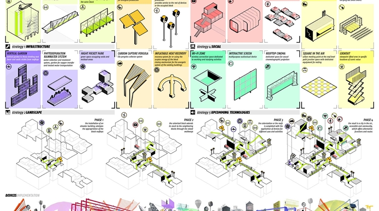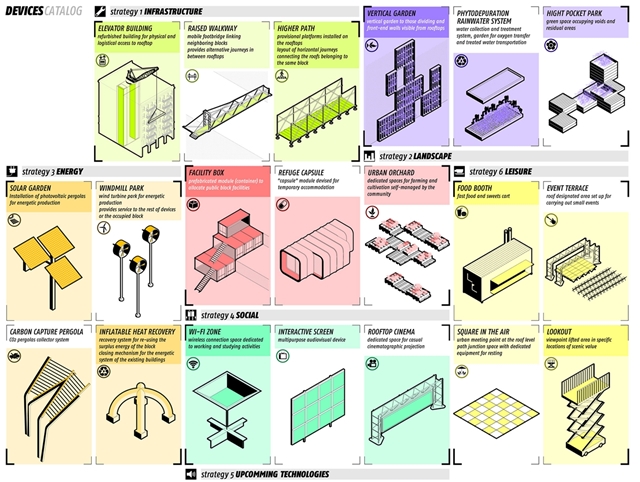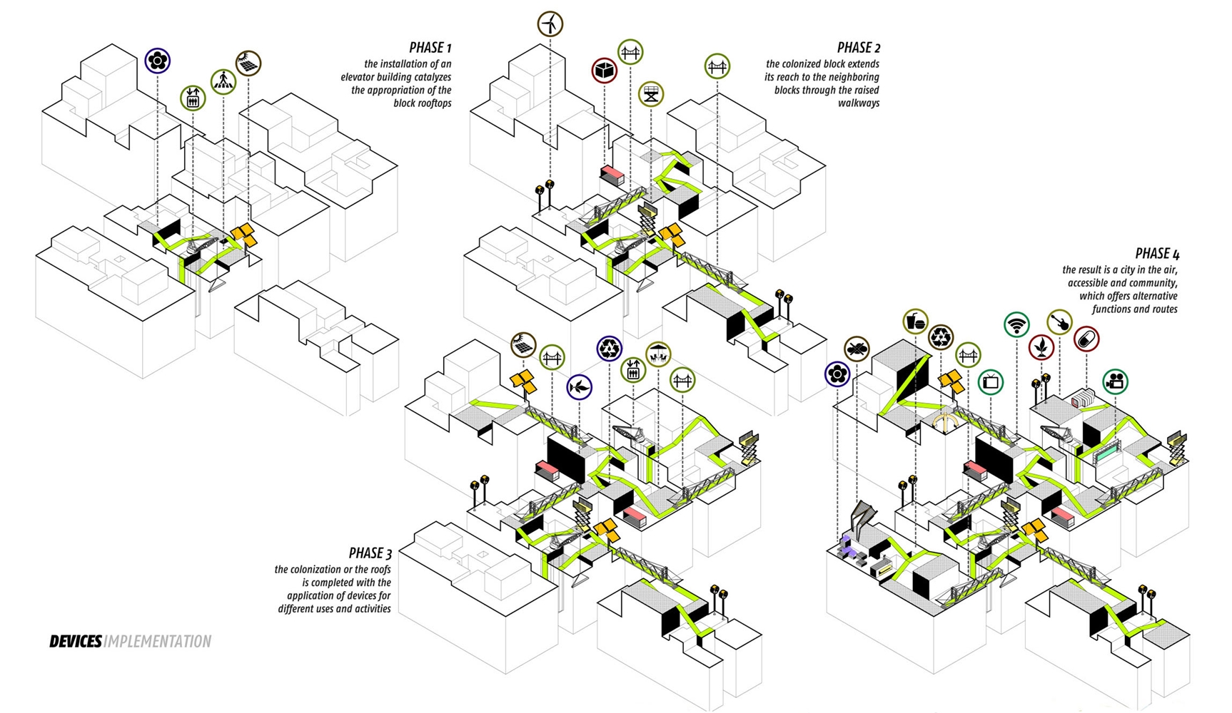 De esta manera, el proyecto plantea un sistema de acciones estratégicas que funciona como catalizador de la ocupación y el aprovechamiento de las cubiertas. Se trata de intervenciones graduales que favorecen la aparición de recorridos, funciones ciudadanas, actividades y equipamientos alternativos a los disponibles en la cota cero de la ciudad.