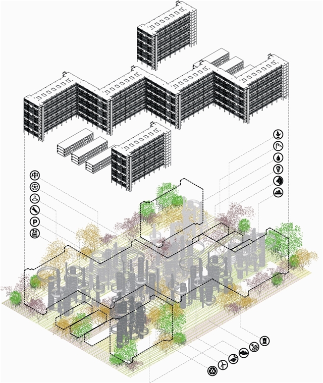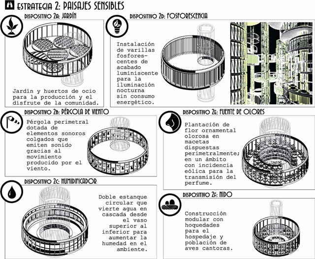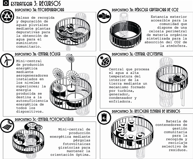 Se plantean para ello tres estrategias de intervención: ordenar un nuevo conjunto de equipamientos, establecer nuevos paisajes sensibles identificativos para la comunidad y resolver las necesidades recursos naturales que implica la autosuficiencia energética.