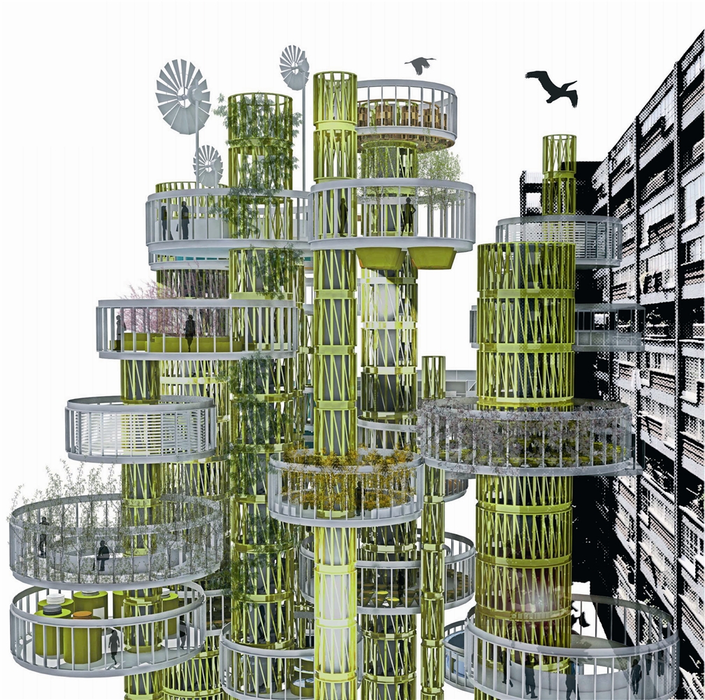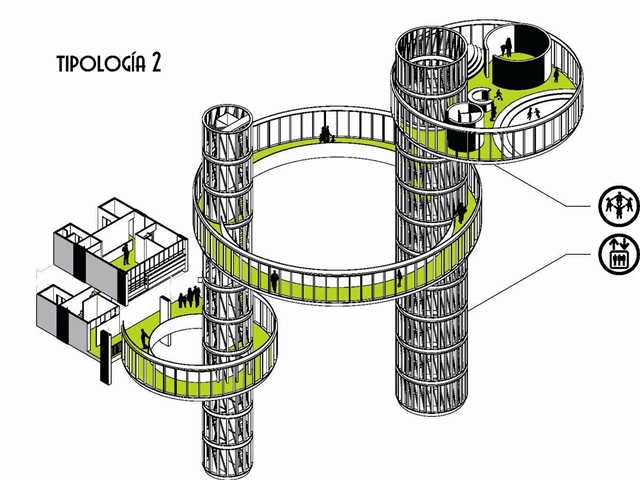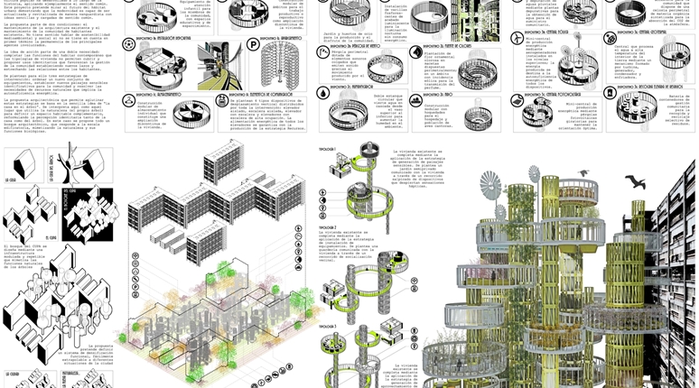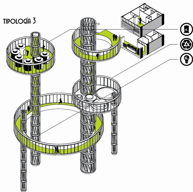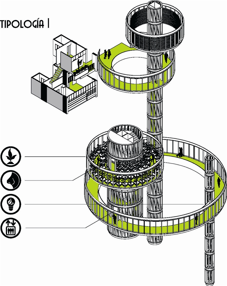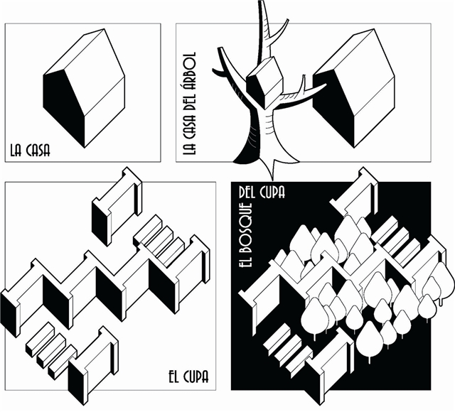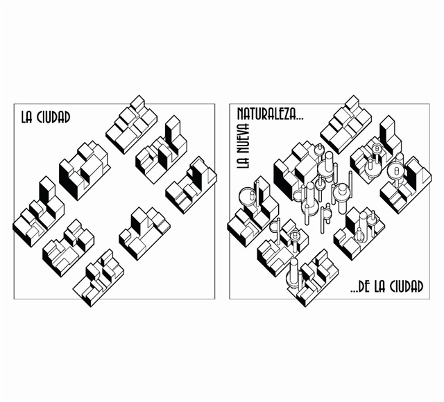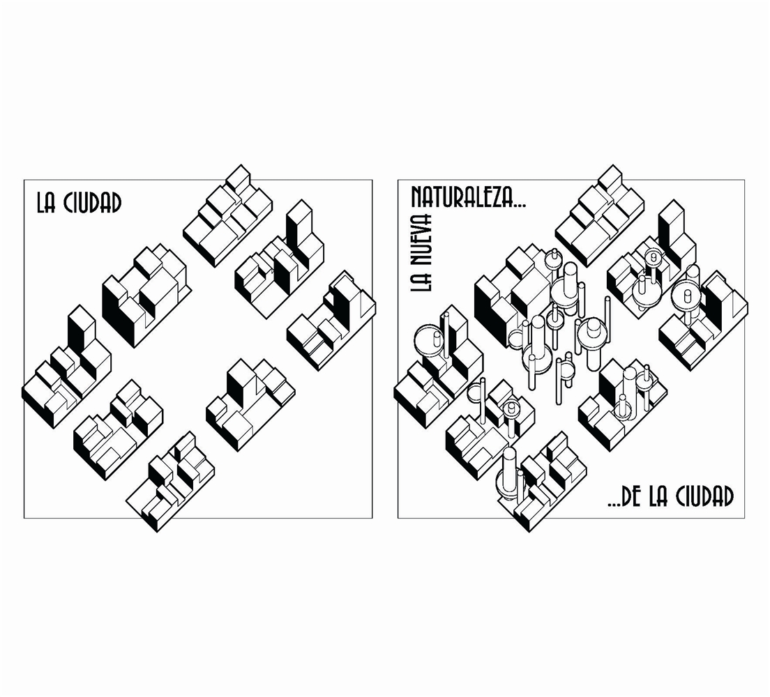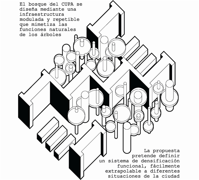 La propuesta arquitectónica que permite aglutinar estas estrategias se basa en la sencilla idea de “la casa en el árbol”. Se interpreta aquí como aquel lugar que utiliza la naturaleza (el propio árbol) para definir un espacio habitable complementario, redefiniendo la percepción identitaria tanto de la casa como del árbol. En este caso se propone todo un bosque arquitectónico, que responde a la escala edificatoria, mimetizando la naturaleza y sus funciones biológicas.