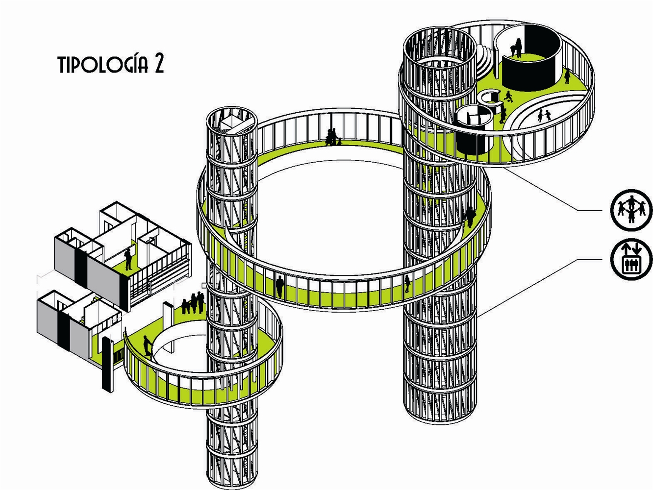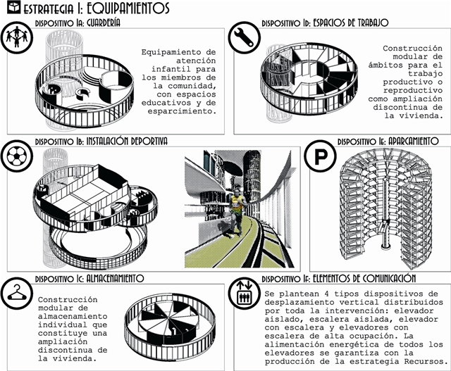 La idea de acción parte de una doble necesidad: completar las funciones del habitar contemporáneo que las tipologías de vivienda no permiten cubrir y proponer usos identitarios que favorezcan la gestión de la comunidad estableciendo nuevos lazos y estrechando las relaciones entre los habitantes.