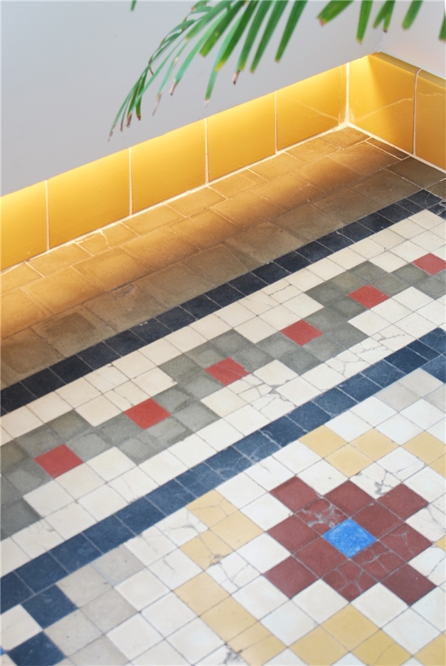 Esta historia única se encierra en los suelos de la vivienda de Nacho y el proyecto busca que quien visite la casa pueda escucharla. Además de su restauración, los trasdosados de fachada se interrumpen a 15 cm del suelo para iluminarlos, el rodapié cerámico lo enmarca recuperando sus colores y el resto de elementos se plantean como un lienzo discreto para no competir con el verdadero protagonista.