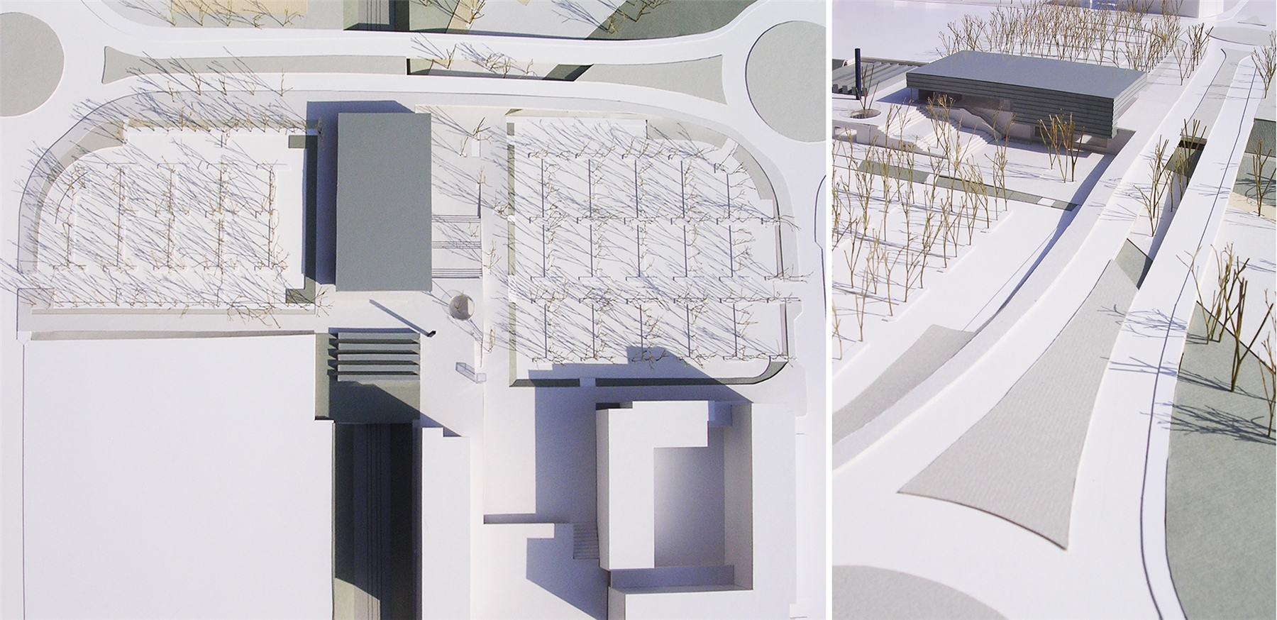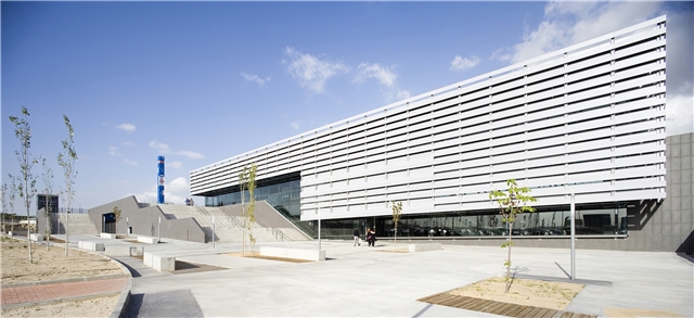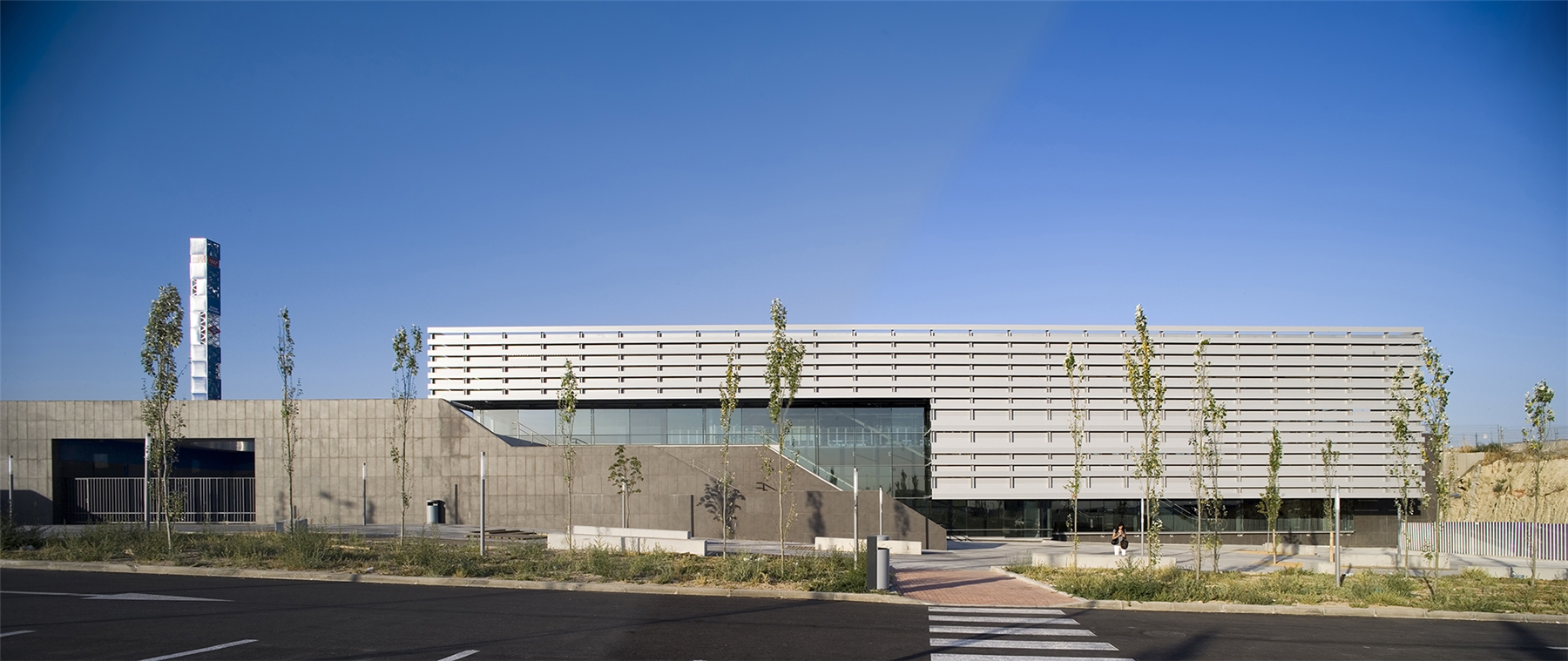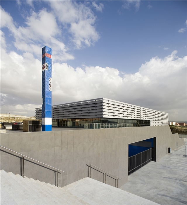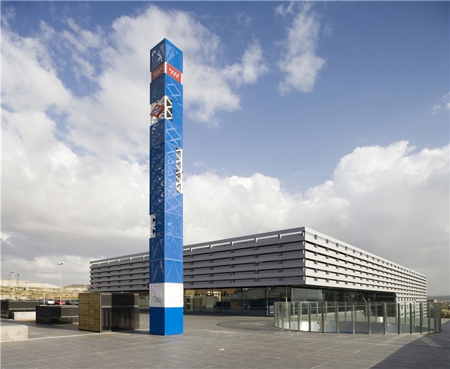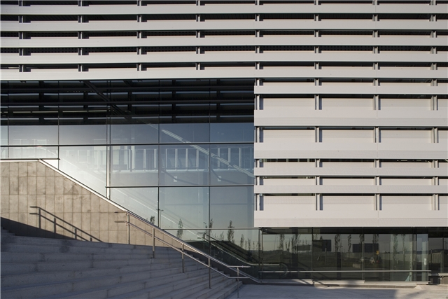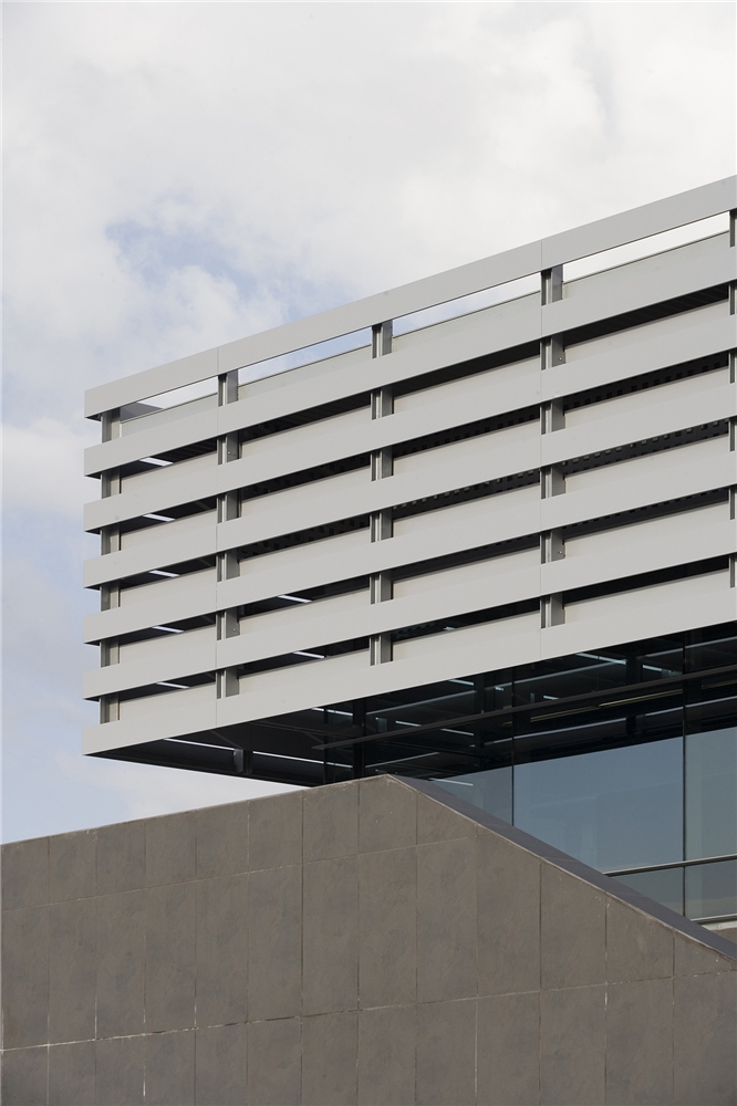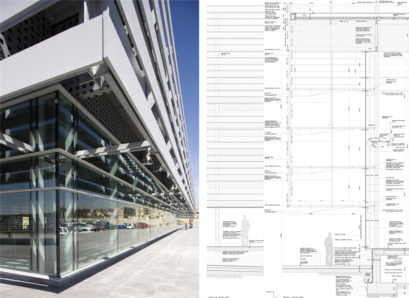Así, se propone la construcción de un basamento capaz tanto de albergar dichos servicios como de generar un espacio público o plaza de acceso previo, que determine en su único acceso a la estación un espacio urbano, puente, no solo de relación de acceso y tránsito urbano, sino con la intención de generar una verdadera plaza y espacio estancial y de relación en vínculo directo con el acceso a la estación. Sobre el mismo, y comprendiendo el espacio interior público de la estación, se dispone una caja de sombra u umbráculo de comprensión bioclimática, realizado mediante un trenzado mediante elementos lineales de aluminio para la proyección solar y abrigo. A dos niveles, para dejar pasar la luz, pero protegerse del soleamiento directo al procurar un tejido que en toda su construcción impide la luz directa y genera una superficie continua de la luz por reflexión. Este umbráculo encierra, con vidrios de control solar, la conformación de una caja previa de vidrio que a su vez procura un espacio en continuidad con el espacio público exterior. En definitiva, una estación que es abrigo y plaza.